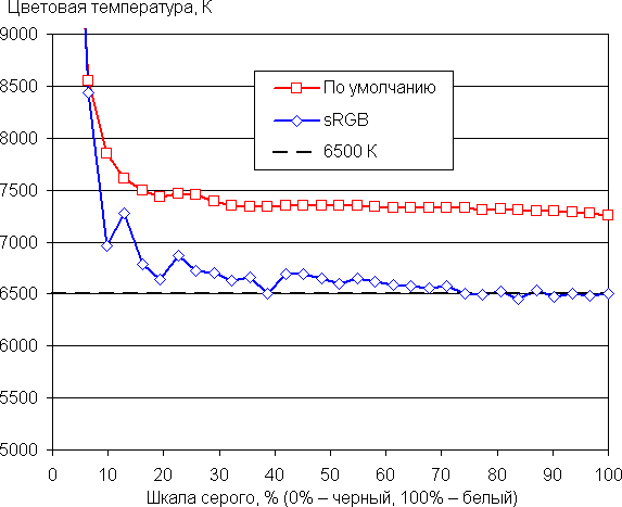 По умолчанию баланс оттенков на шкале серого приемлемый, так как цветовая температура достаточно близка к стандартным 6500 К, и отклонение от спектра абсолютно черного тела (ΔE) только на участке в темной области немного выше 10, что для потребительского устройства можно простить. При этом цветовая температура и ΔE мало изменяются от оттенка к оттенку — это положительно сказывается на визуальной оценке цветового баланса. (Самые темные области шкалы серого можно не учитывать, так как там баланс цветов не имеет большого значения, да и погрешность измерений цветовых характеристик на низкой яркости большая.)