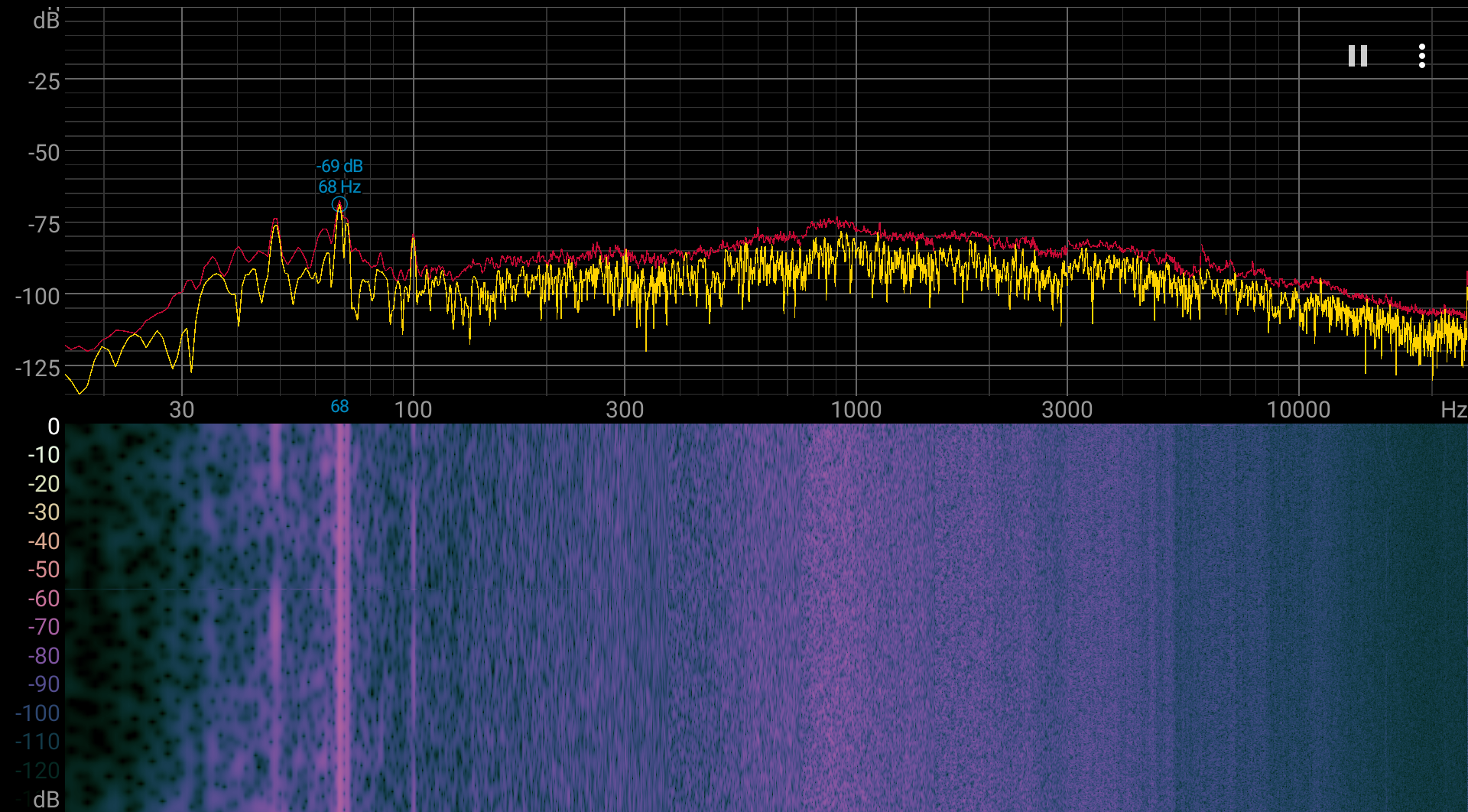 Если ноутбук не нагружать совсем, то его система охлаждения в указанных выше условиях не может долговременно работать в пассивном режиме. Впрочем, в этом случае шум от системы охлаждения очень низкий. В профиле Баланс даже при большой нагрузке шум от системы охлаждения умеренный. Включение профиля Производительность повышает как одноименную характеристику, так и уровень шума. В любом случае характер шума ровный и раздражения не вызывает. Спектрограмма, полученная для максимальной скорости вентиляторов, достаточно ровная, и в диапазоне частот, где звуки могут вызывать особенное раздражение, выраженных пиков нет: