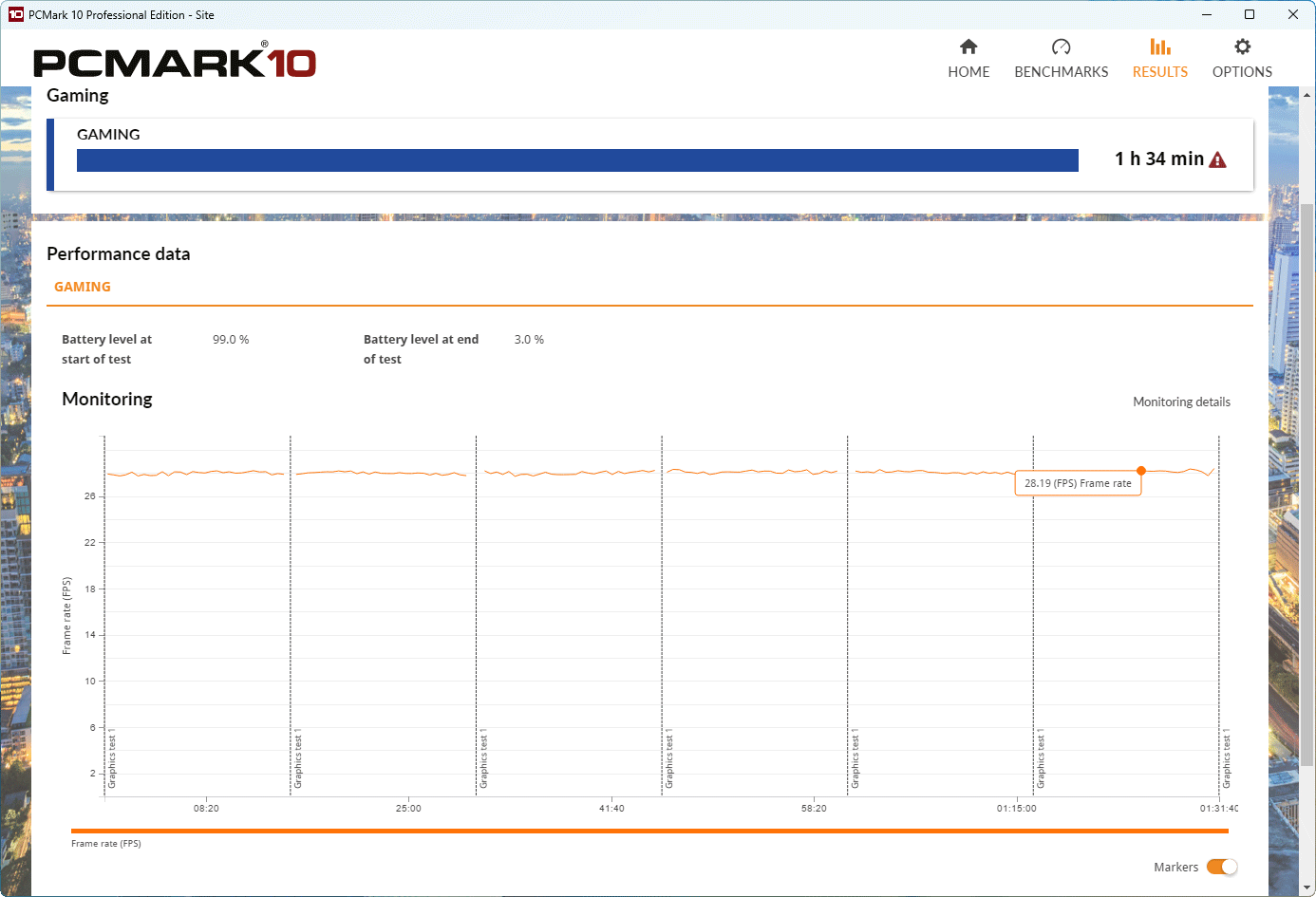 В режиме «Gaming» при 100% яркости экрана аккумулятора хватило на 1 час и 28 минут, то есть всего на 6 минут меньше, чем при яркости 100 нит.