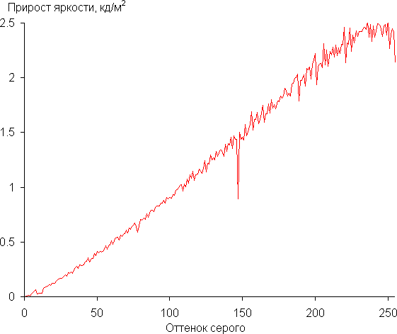 Далее мы измерили яркость 256 оттенков серого (от 0, 0, 0 до 255, 255, 255). График ниже показывает прирост (не абсолютное значение!) яркости между соседними полутонами: