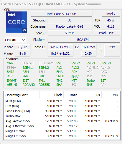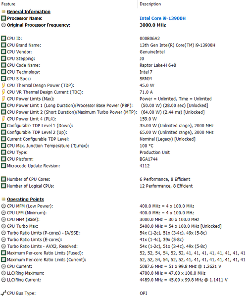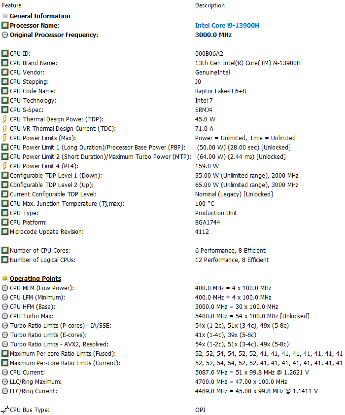| Процессор | Core i9-13900H (Raptor Lake-H, 6 P-ядер/12 потоков 2,6—5,4 ГГц + 8 E-ядер 1,4—4,1 ГГц, L3-кэш 24 МБ, TDP 35—115 Вт) доступны конфигурации с процессорами Core i3-1215U, Core i5-12450H, Core i5-13420H и Core i7-13700H | |