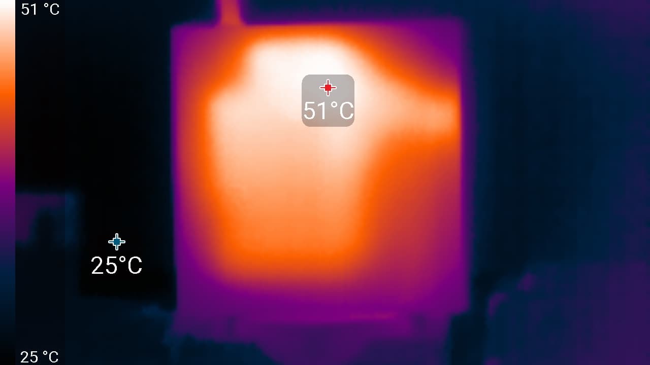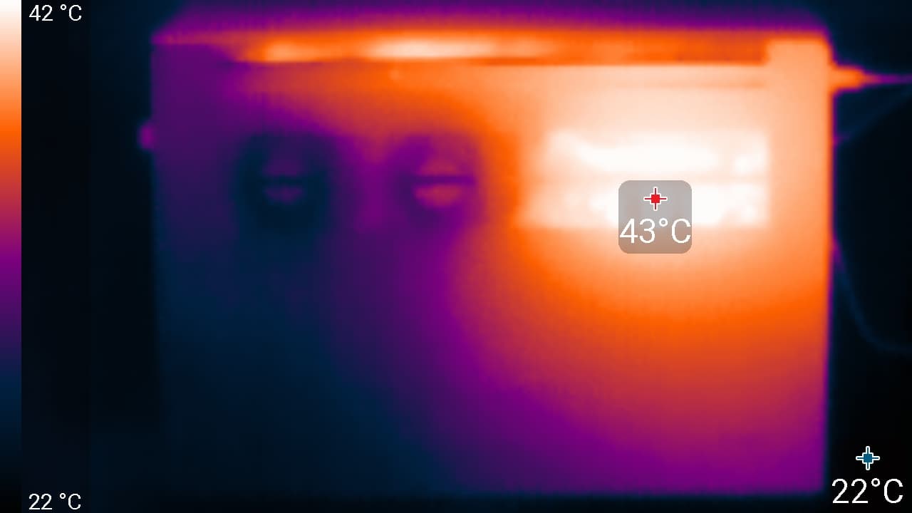 Под максимальной нагрузкой работать с клавиатурой комфортно, так как места под запястьями едва нагреваются. Держать ноутбук на коленях неприятно, так как левое колено ощущает значительный нагрев днища ноутбука (нагрев над правым также чувствуется). Блок питания греется очень сильно, поэтому при долговременной работе с большой производительностью лучше следить, чтобы он не был чем-то накрыт.