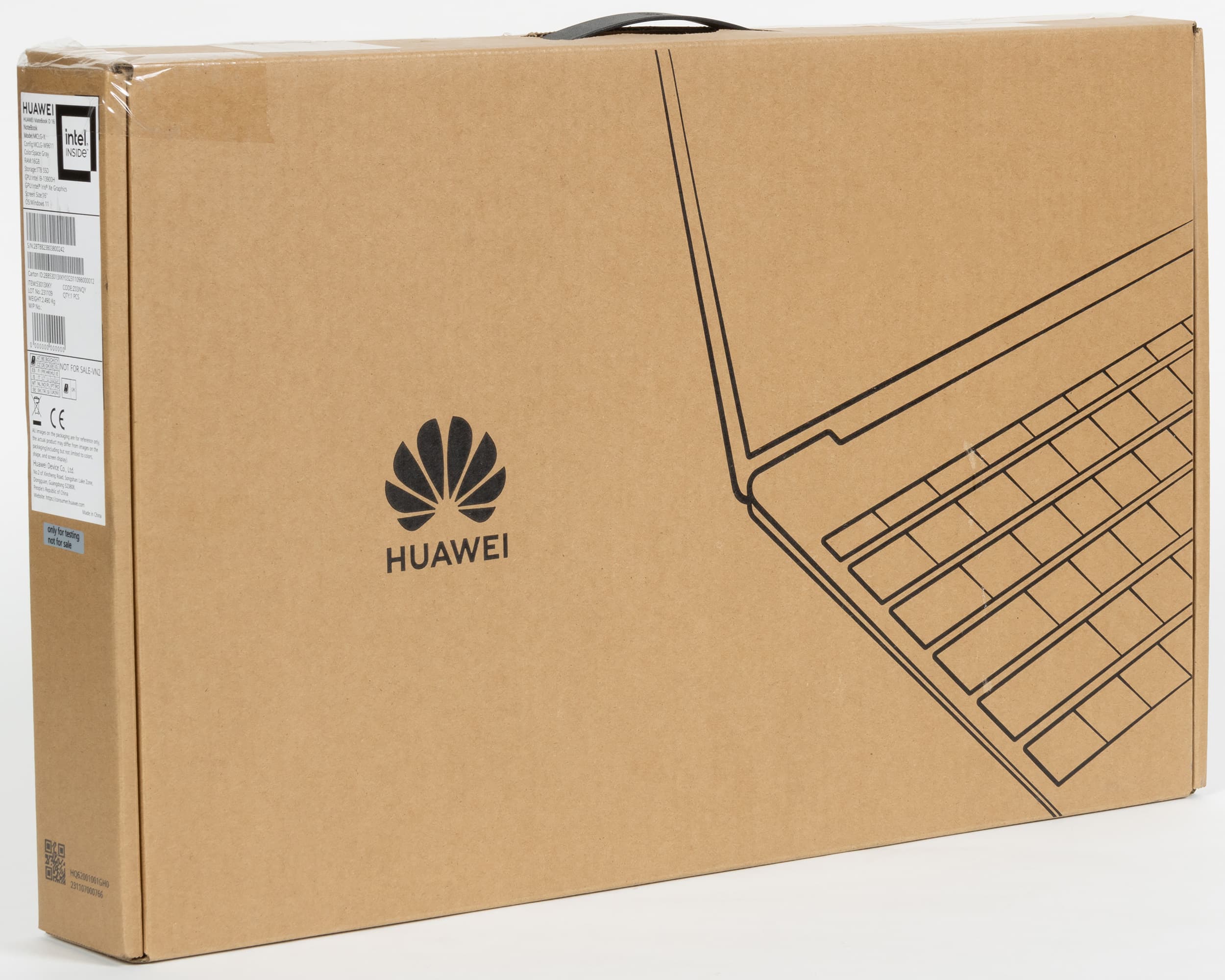 Huawei MateBook D 16 2024 поставляется в простой картонной коробке с пластиковой ручкой для переноски. Информацию о конфигурации ноутбука можно почерпнуть с наклейки на ее торце.