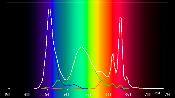Поэтому визуально цвета изображений, ориентированных на вывод в пространстве sRGB, на этом экране имеют естественную насыщенность. Ниже приведен спектр для белого поля (белая линия), наложенный на спектры красного, зеленого и синего полей (линии соответствующих цветов):