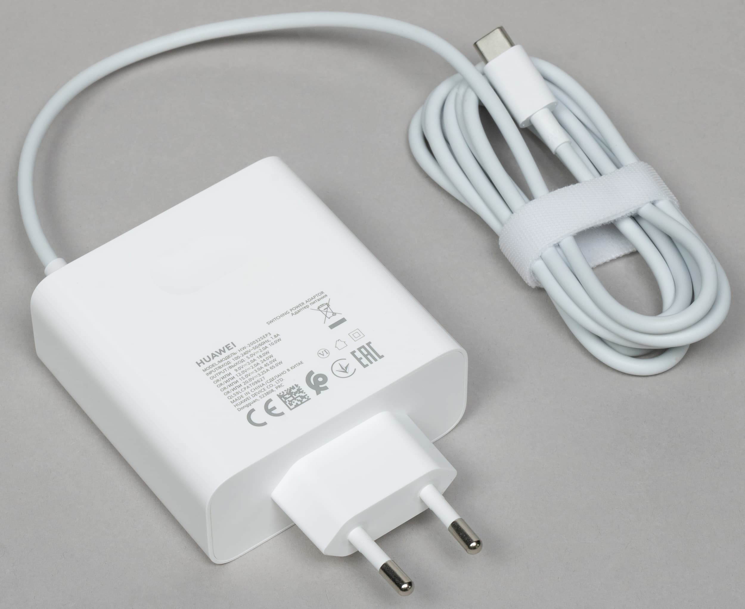 В комплект поставки Huawei MateBook D 16 2024 входит адаптер питания с маркировкой HN-200325EP3 мощностью до 65 Вт (20,0 В, 3,25 А), а его отличительной особенностью является встроенный в блок кабель USB Type-C длиной 1,8 м.