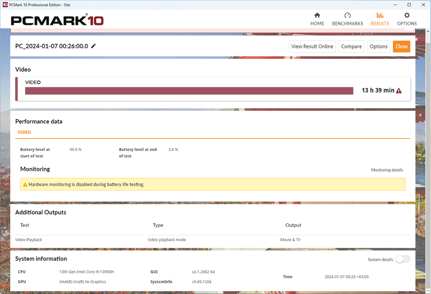 Получилось, что набирать текст за Huawei MateBook D 16 2024 можно почти 17 часов, что значительно выше 11 часов, показанных в таком же тестировании прошлогодней моделью MateBook D 16. Воспроизведение полноэкранного видео может длится ровно 12 часов, причем примерно такую же автономность ноутбука продемонстрировали и дополнительные тесты PCMark’10, результаты которых мы приводим далее.
