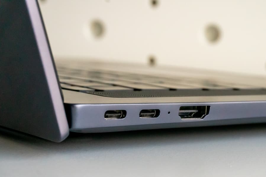 Набор портов близок к идеальному: два USB Type-C (поддерживается Display Port 1.4), два «обычных» USB Type-A (стандарта USB 3.2 Gen1), полноразмерный HDMI и аудиоразъём. Отличный набор для затянувшегося периода перехода к USB Type-C.