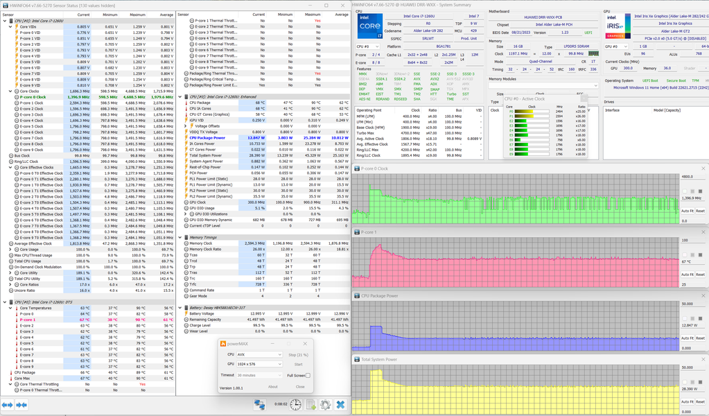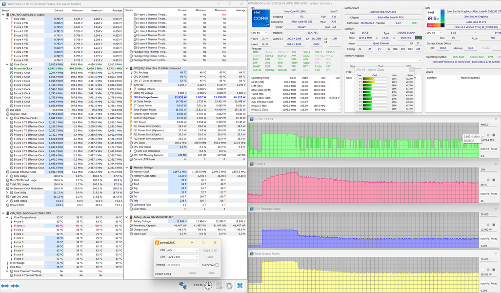 Мы протестировали оба режима MateBook E 2023 с помощью стресс-утилиты powerMax с использованием AVX-инструкций, а мониторинг осуществлялся HWinfo. Сравним работу процессора и других компонентов MateBook в двух режимах (пока при питании от электросети). Параметры в подписях указаны после стабилизации.