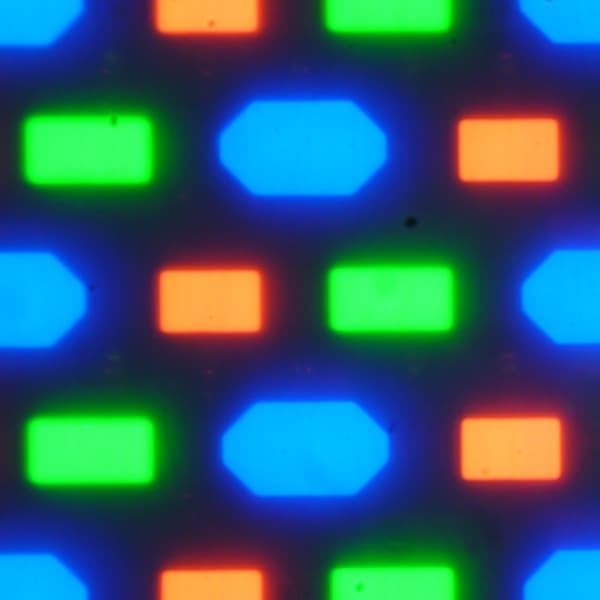 В этом OLED-экране полноцветное изображение создается с помощью субпикселей трех цветов — красного (R), зеленого (G) и синего (B) в равном количестве — по три разного вида на пиксель. Это подтверждается фрагментом микрофотографии: