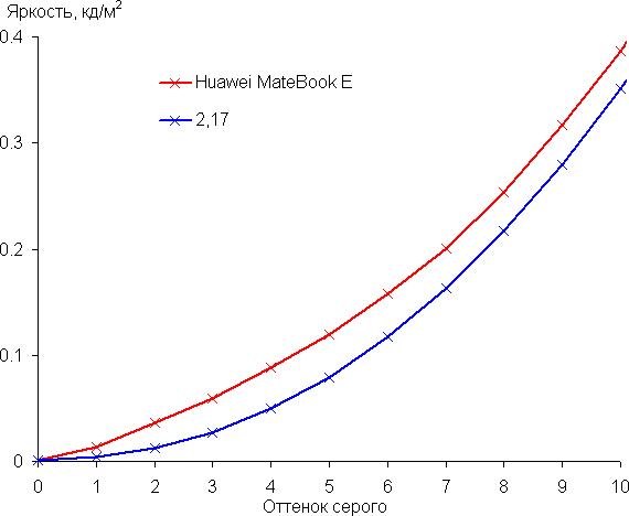 Аппроксимация полученной гамма-кривой дала показатель 2,17, что немного ниже стандартного значения 2,2, при этом реальная гамма-кривая мало отклоняется от аппроксимирующей степенной функции: