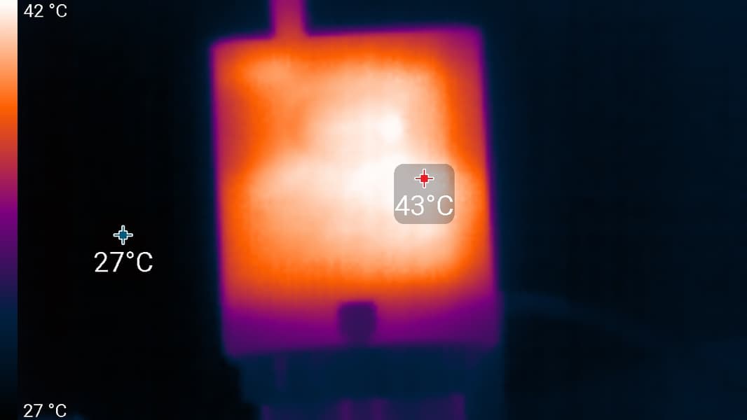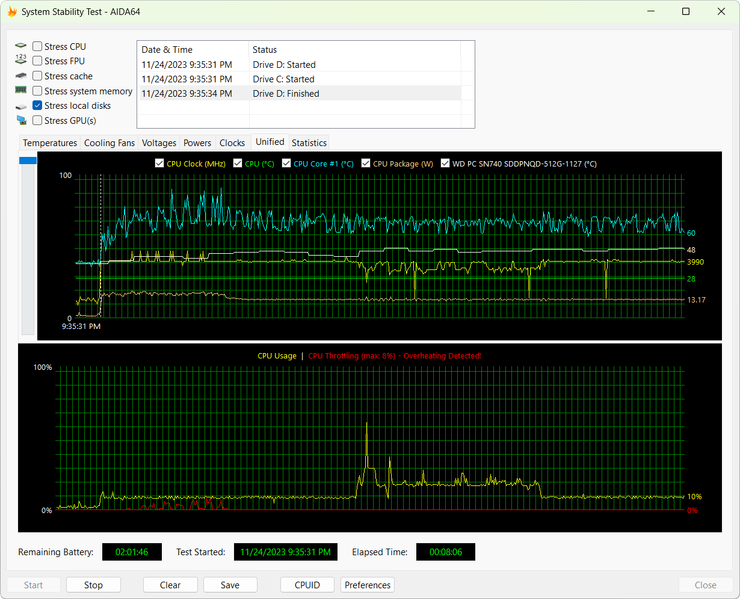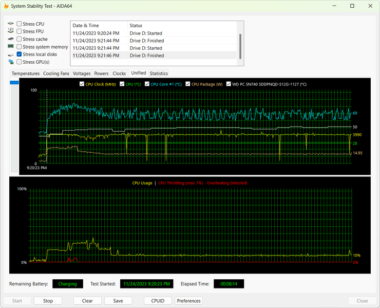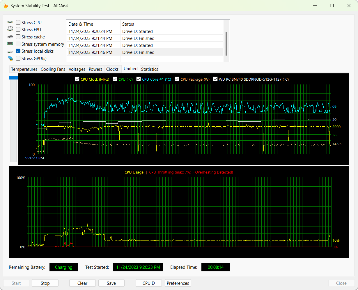Несмотря на высокий уровень производительности, нагревается SSD умеренно. Так, например, в стресс-тесте AIDA64 его удалось прогреть только до 50 °C при питании от электросети и до 48 °C при питании от встроенного аккумулятора.