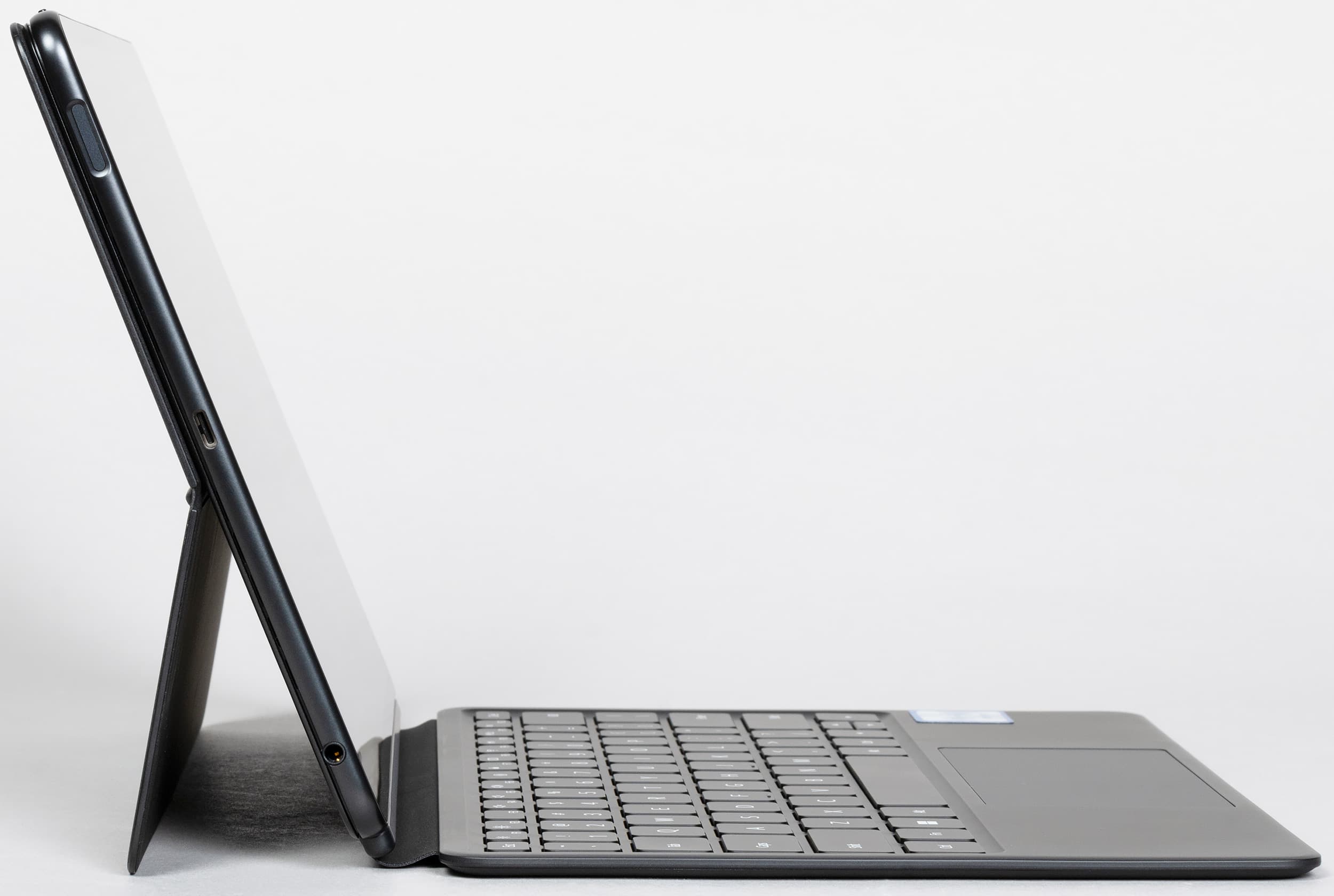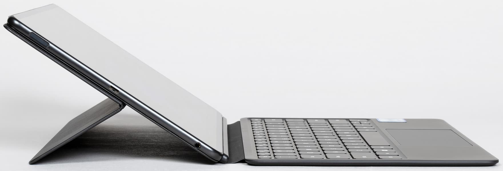 Клавиатура здесь на магнитном креплении, примагничивается к корпусу планшета очень надежно, но как ноутбук одной рукой MateBook E в раскрытом состоянии не перенести.