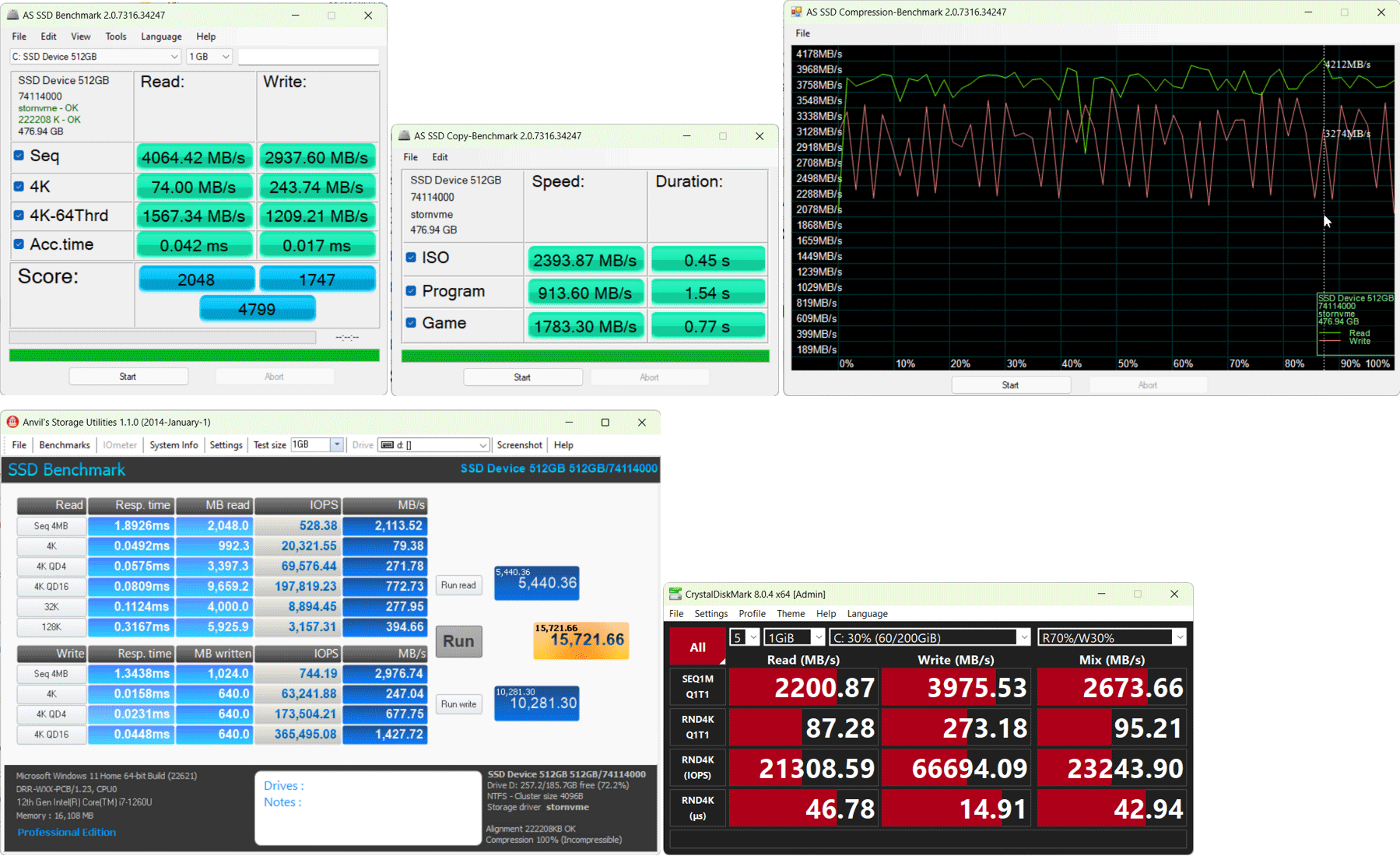 Судя по тестам производительности Silicon Motion PCIe-8, которые нам удалось найти в сети, SSD в Huawei MateBook E 2023 заметно быстрее. Мы протестировали накопитель как при питании от электросети, так и в автономном режиме работы, получив следующие показатели.