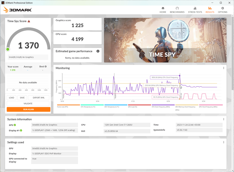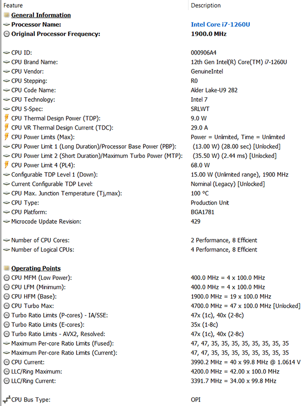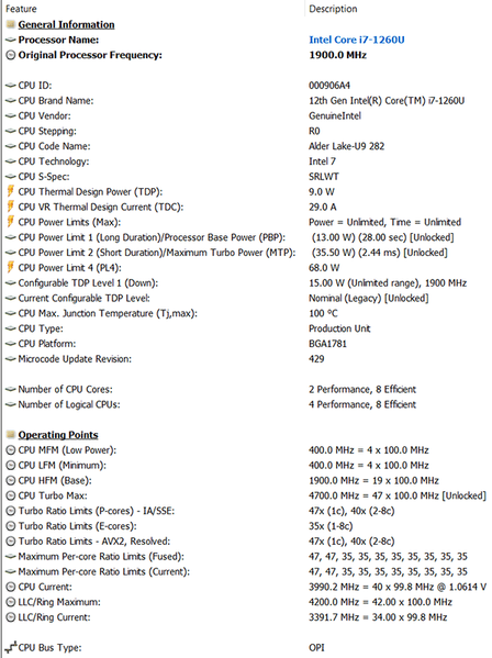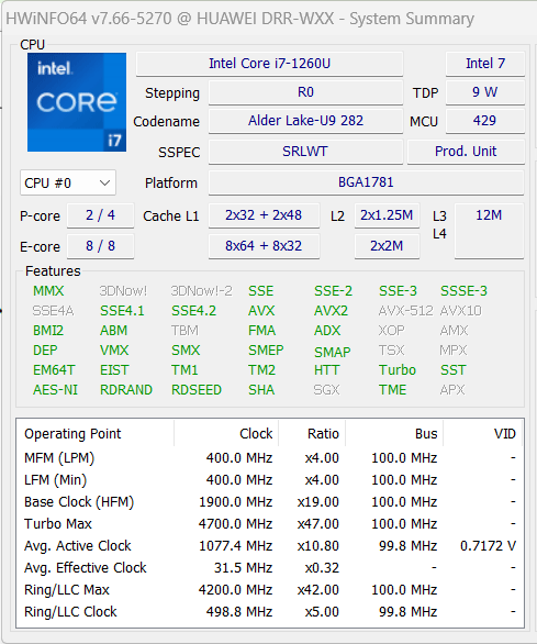 Да, это энергоэффективная версия процессора с литерой U (по-другому в планшете и быть не могло), но даже здесь турбочастоты P-ядер могут повышаться до 4,7 ГГц, а энергоэффективных — до 3,5 ГГц. Тепловыделение процессора весьма скромное и равно 9 ваттам, однако, по данным HWinfo, в данной модели оно может кратковременно повышаться до 35,5 ватт.