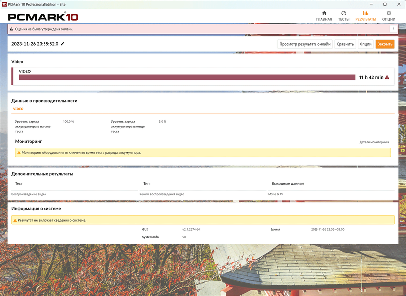 Получилось, что набирать текст можно в течении восьми часов при частоте экрана 120 Гц и девять с половиной часов при 60 Гц. Видео можно смотреть без малого девять часов на 120 Гц. Дополнительные тесты автономности устройства с помощью пакета PCMark’10 продемонстрировали примерно такой же порядок цифр.