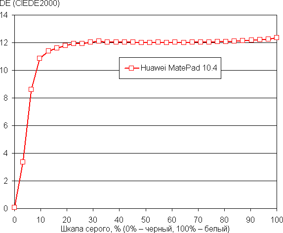 По умолчанию баланс оттенков на шкале серого средний, так как цветовая температура существенно выше стандартных 6500 К, и отклонение от спектра абсолютно черного тела (ΔE) больше 10, что даже для потребительского устройства считается плохим показателем. (Самые темные области шкалы серого можно не учитывать, так как там баланс цветов не имеет большого значения, да и погрешность измерений цветовых характеристик на низкой яркости большая.)