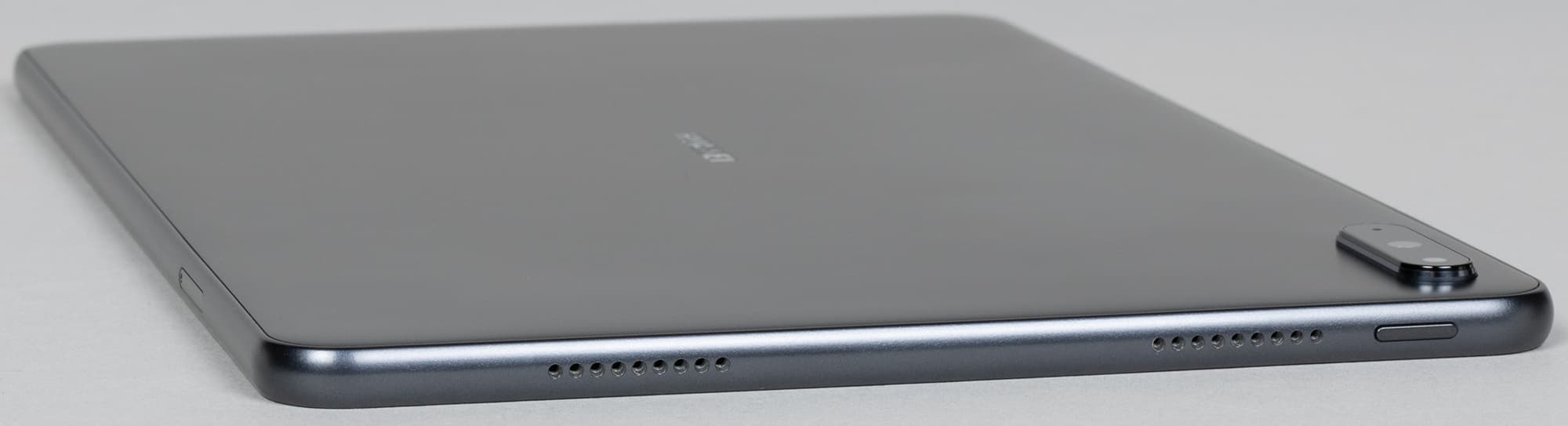 На скругленных боковых гранях расположены стереодинамики (для бюджетного планшета это плюс). Кроме того, на правой грани по центру есть разъем USB-C, а на левой — небольшая продолговатая кнопка питания.