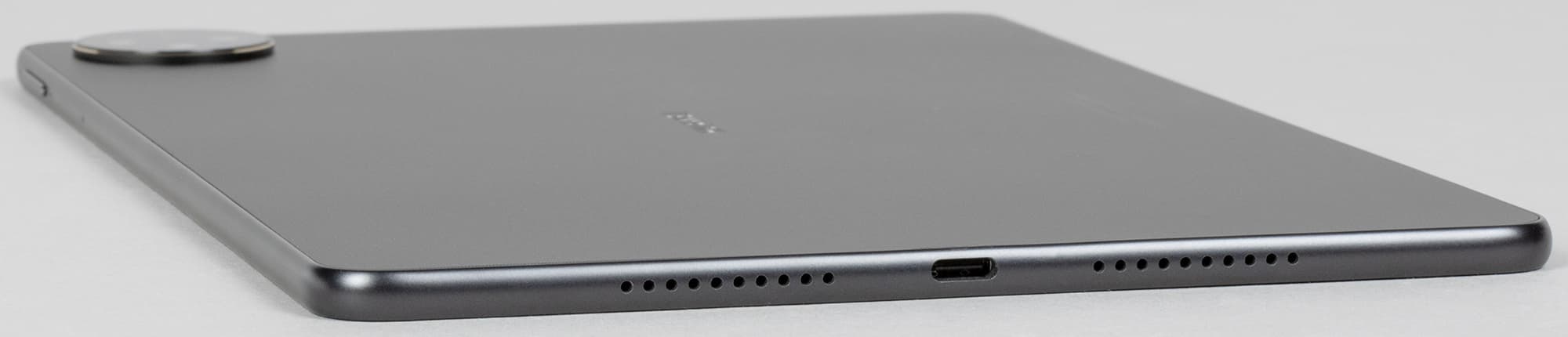 Разъем 3,5 мм для подключения проводной гарнитуры отсутствует, и это следование моде, введенной одной яблочной компанией, не кажется нам правильным решением, тем более в случае с планшетом, который предназначен в том числе для просмотра видео. С другой стороны, может быть, такое решение позволило добиться исключительно малой толщины корпуса.