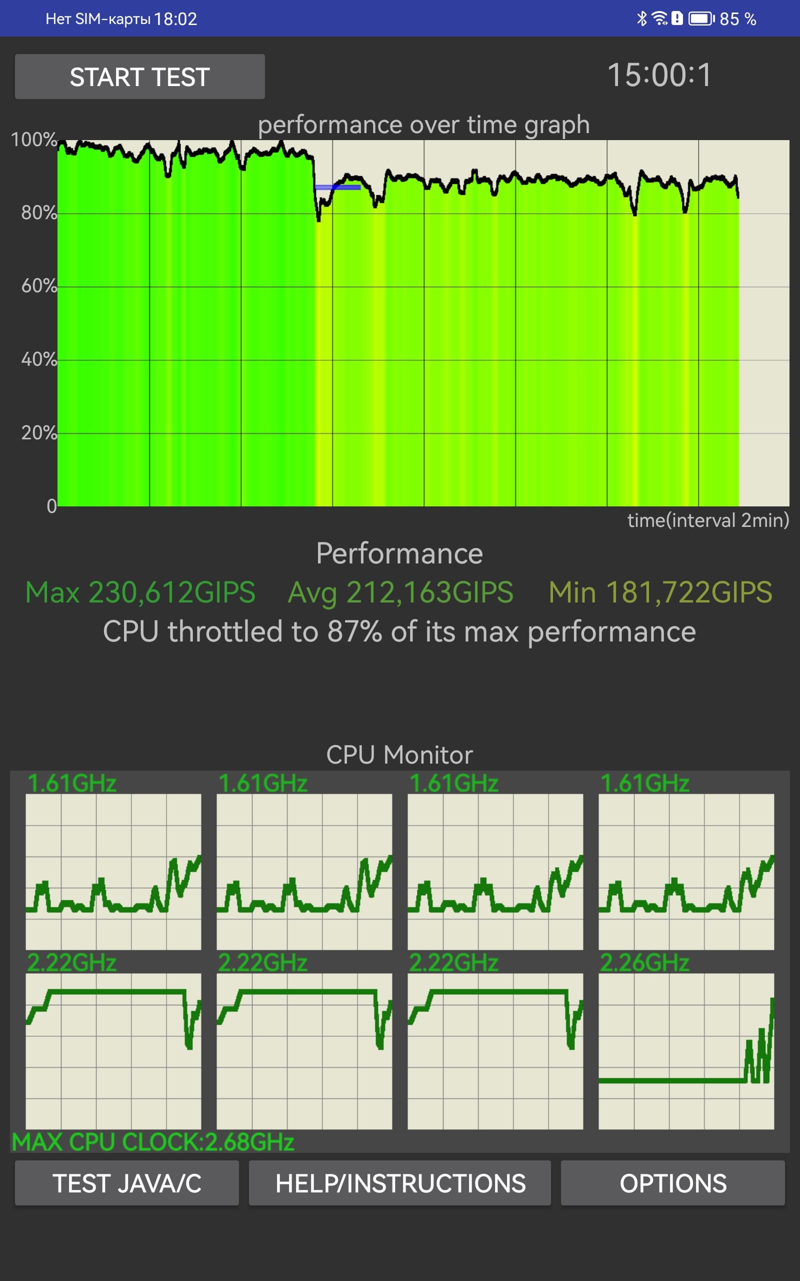 Тротлинг у планшета средний — тест в приложении CPU Throttling Test дал результат 87%. В общем, среди Android-планшетов это сейчас одна из самых производительных моделей.