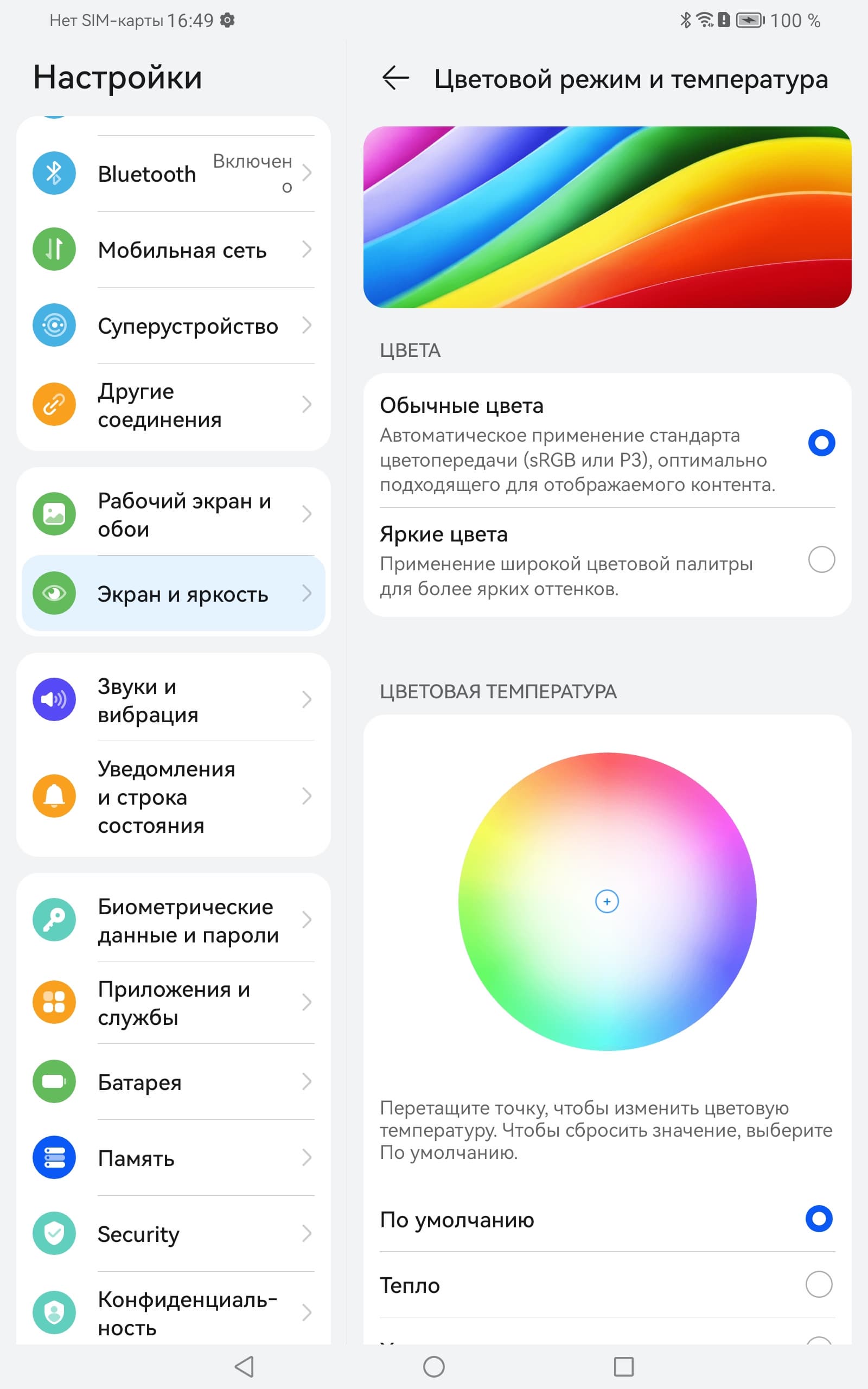 Цветопередача хорошая, цвета в меру насыщенные, цветовой баланс у экранов немного различается. Напомним, что фотография не может служить надежным источником сведений о качестве цветопередачи и приводится только для условной наглядной иллюстрации. В частности, выраженный красноватый оттенок белого и серого полей, присутствующий на фотографиях экрана Huawei MatePad Pro 11, при перпендикулярном взгляде визуально отсутствует, что подтверждается аппаратными тестами с помощью спектрофотометра. Причина в том, что спектральная чувствительность матрицы фотоаппарата неточно совпадает с этой характеристикой человеческого зрения.