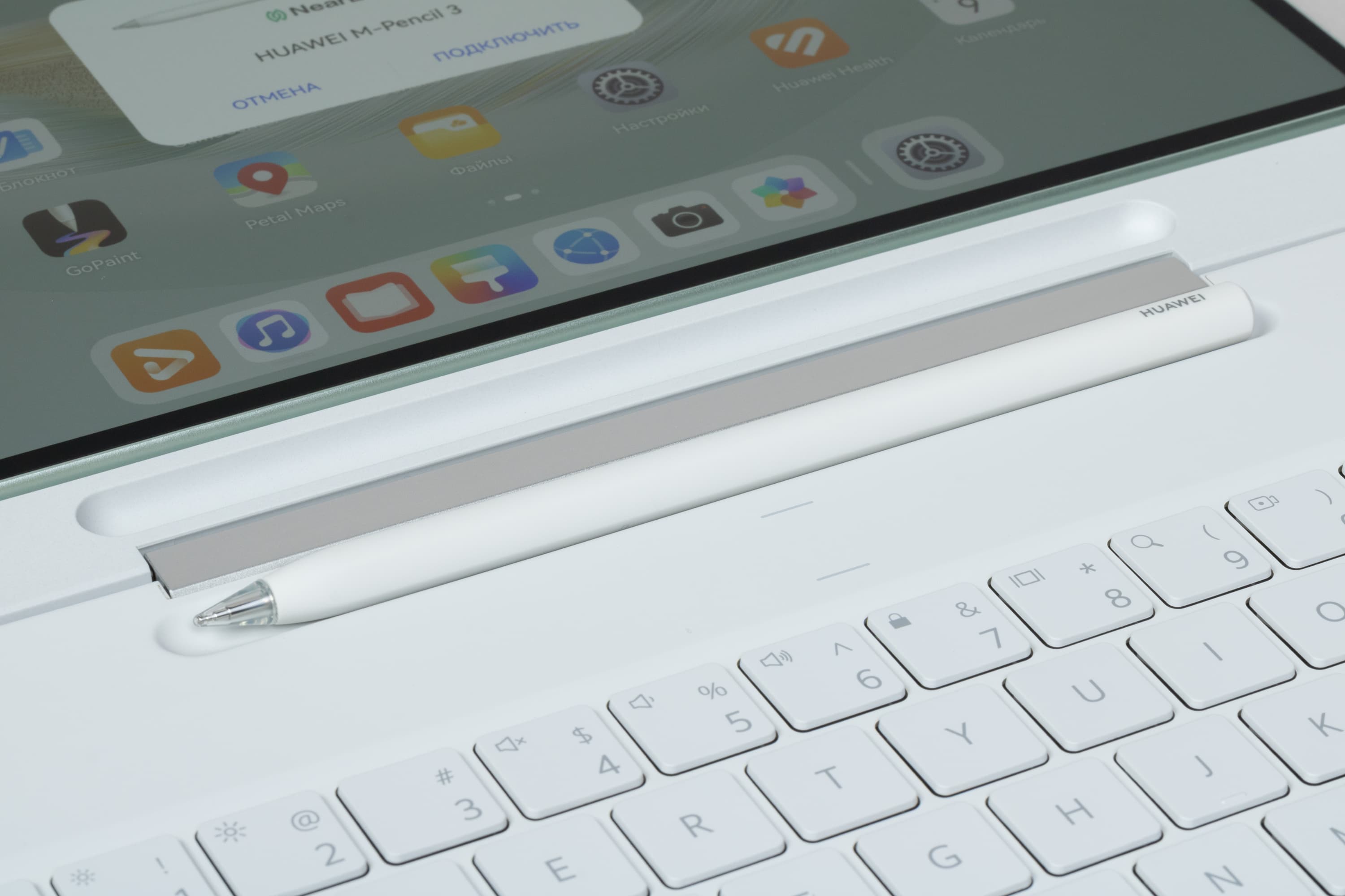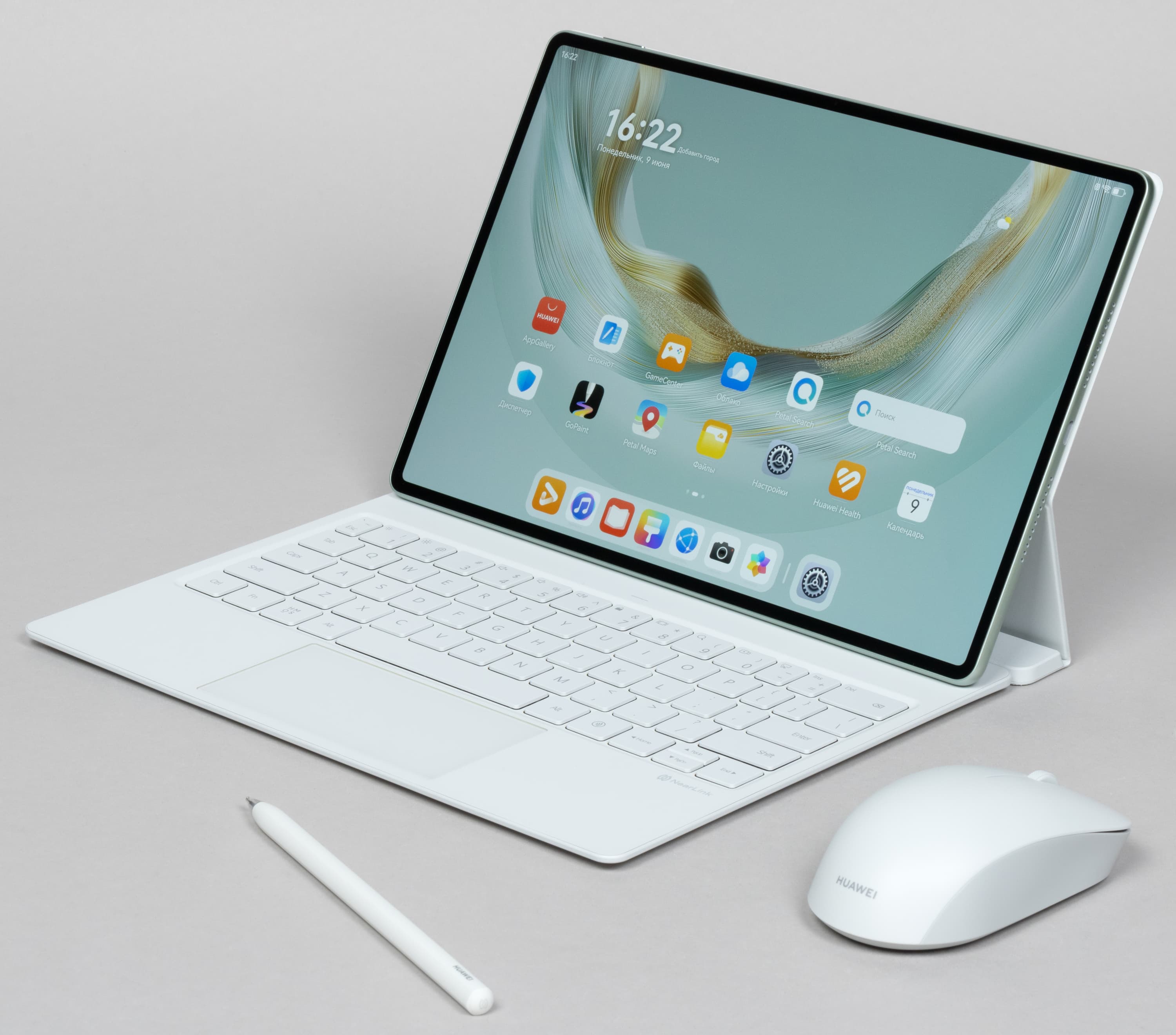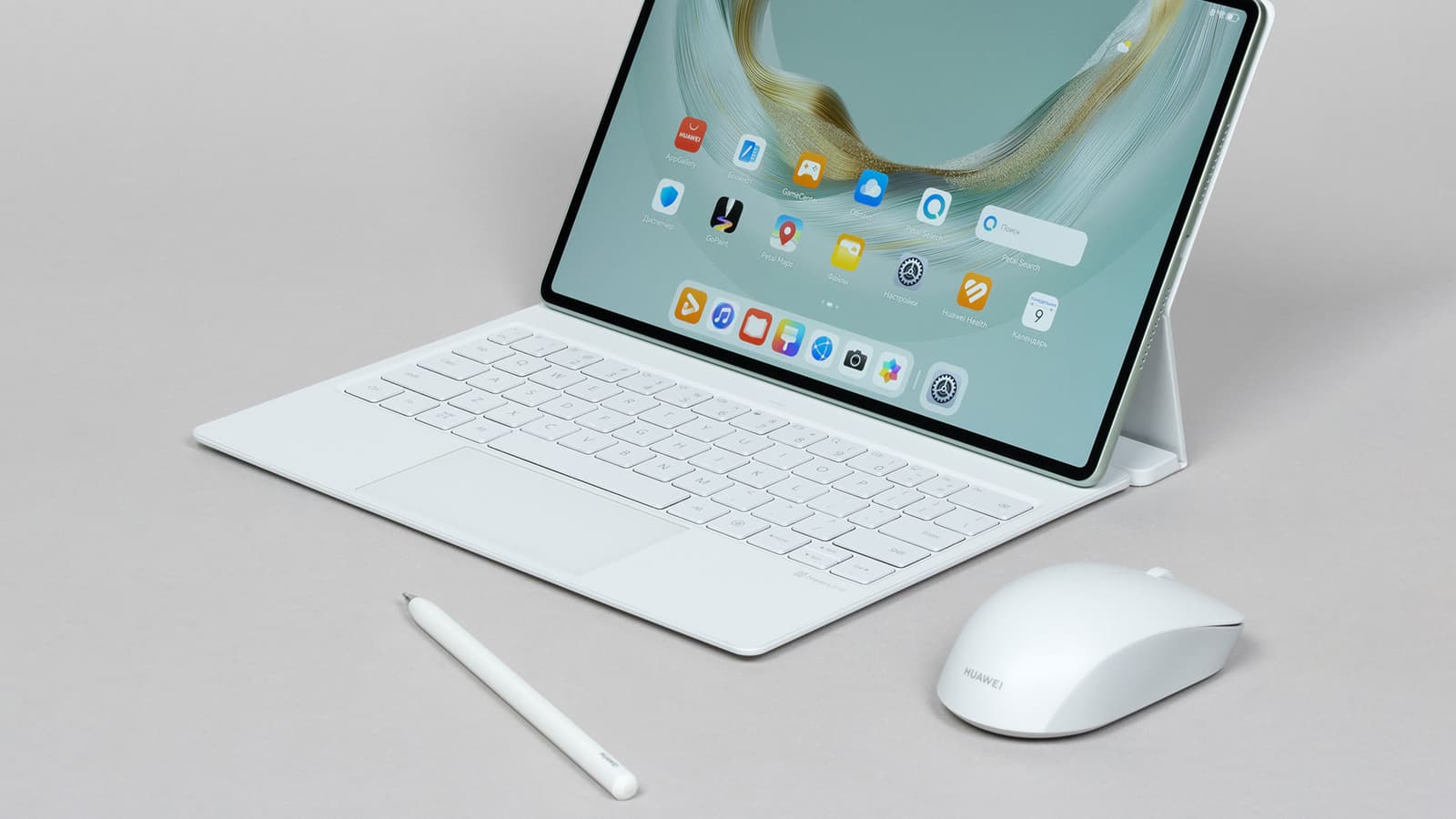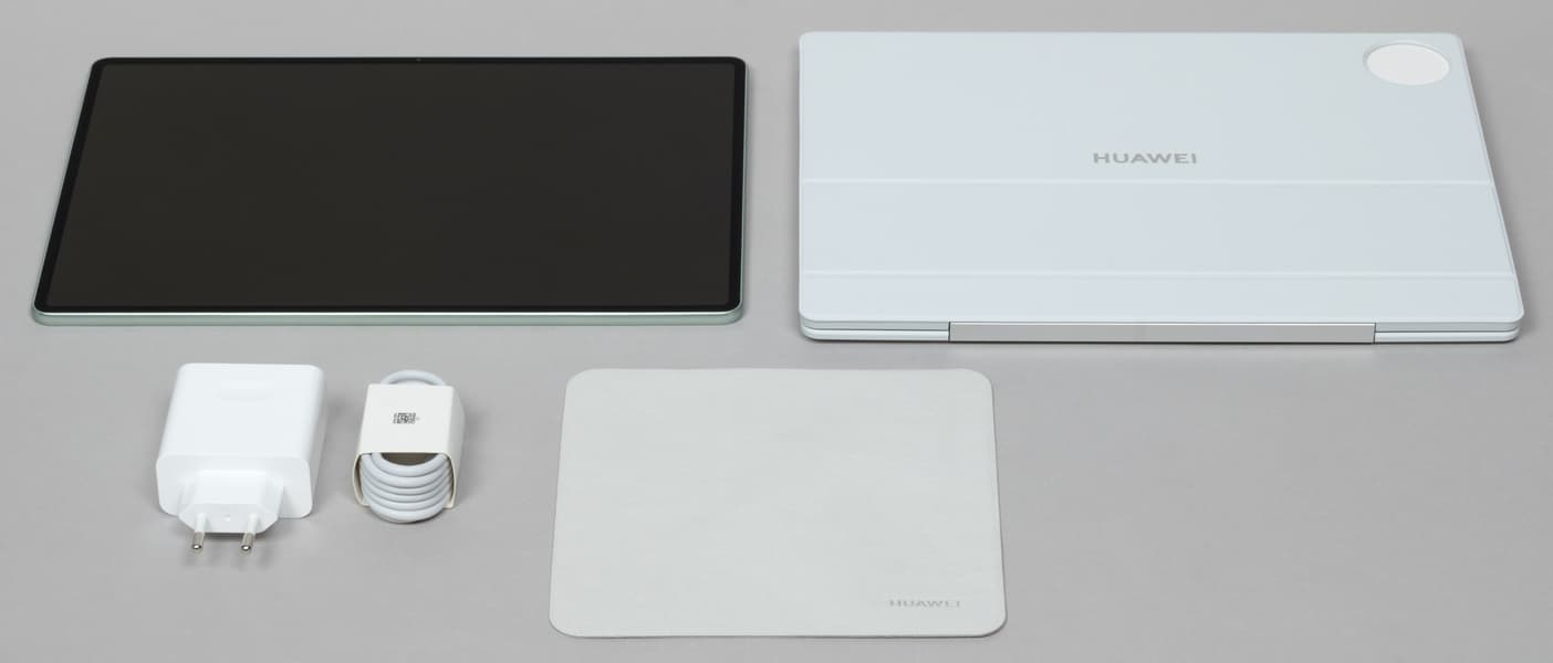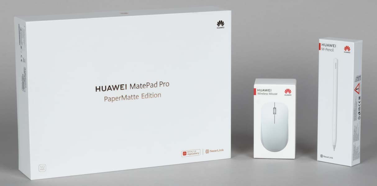 Как и раньше, планшет поставляется вместе с обложкой-клавиатурой, в дополнение к которой можно бесплатно получить стилус M-Pencil. Всё это и приехало к нам на тестирование. А еще — мышь Huawei Wireless Mouse впридачу. Каждый аксессуар располагается в отдельной упаковке.