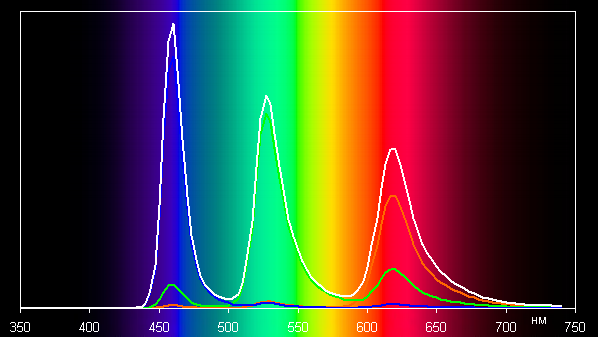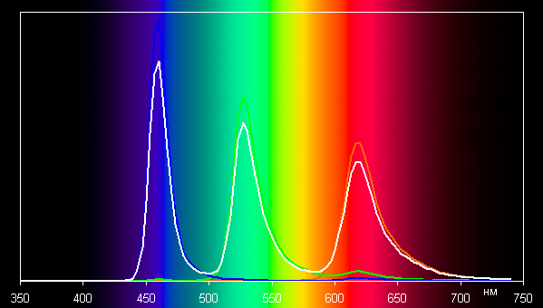 В первом случае спектры компонент (то есть спектры чистых красного, зеленого и синего цветов) очень хорошо разделены: