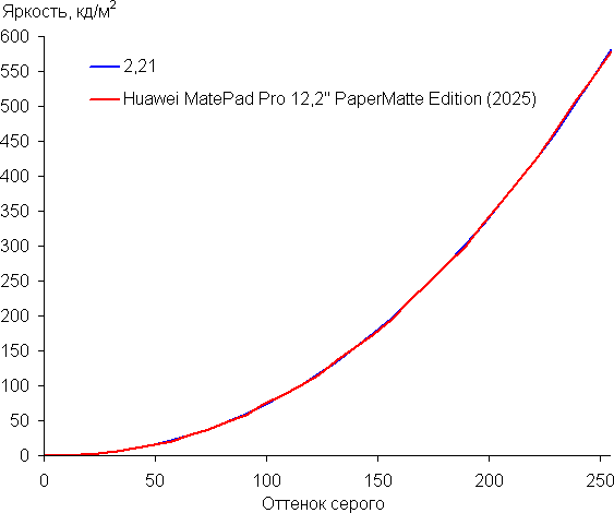 Построенная по 32 точкам с равным интервалом по численному значению оттенка серого гамма-кривая показала, что существенного завала нет ни в светах, ни в тенях. Показатель аппроксимирующей степенной функции равен 2,21, что очень близко к стандартному значению 2,2, при этом реальная гамма-кривая мало отклоняется от степенной зависимости: