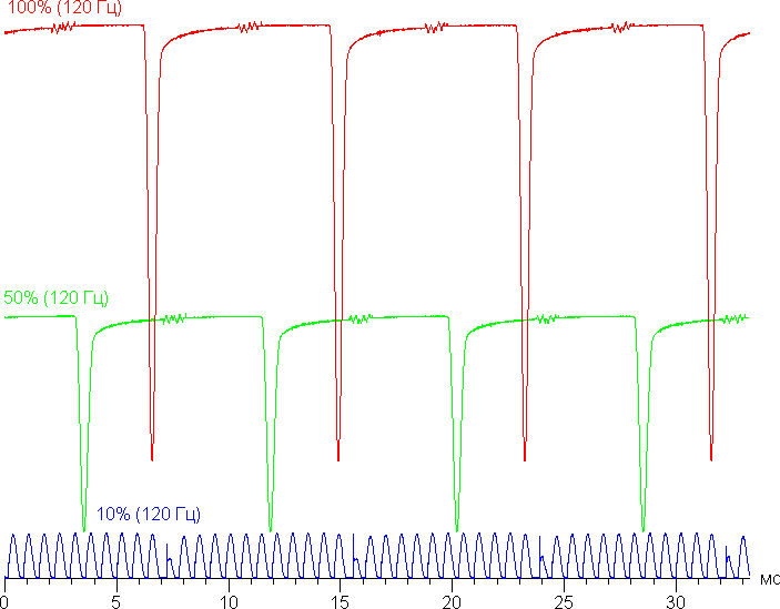 Видно, что на высокой и средней яркости частота невысокая (120 Гц), но и скважность модуляции низкая, в итоге видимого мерцания нет. При сильном понижении яркости появляется модуляция с высокой частотой (1,44 кГц) поэтому видимое мерцание всё так же отсутствует.