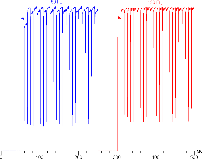 В режиме 120 Гц плавность прокрутки меню с настройками и т. д. заметно повышается. Посмотрим, изменится ли при этом характер модуляции. Режим с частотой обновления 120 Гц: