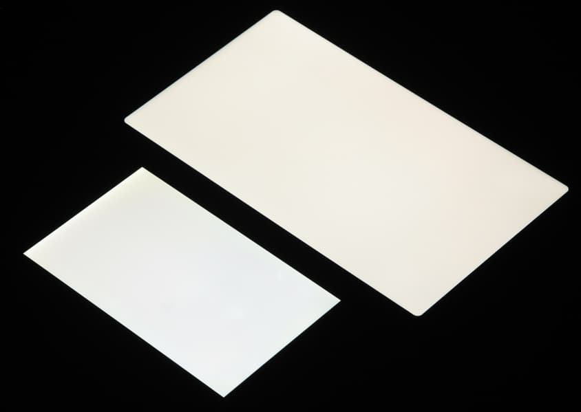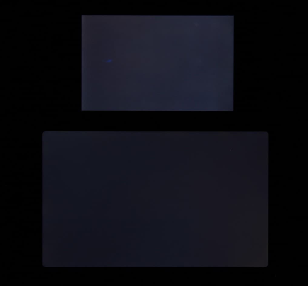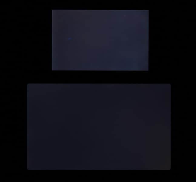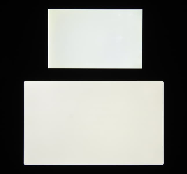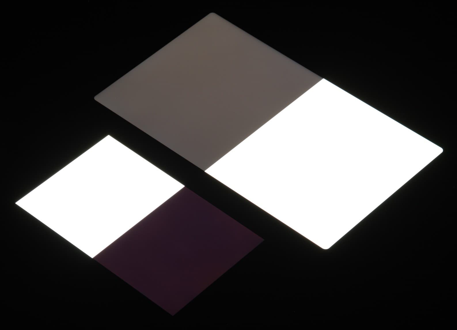 Яркость под углом у экранов уменьшилась (как минимум в 5 раз, исходя из разницы в выдержке), и снизилась примерно одинаково. Черное поле при отклонении по диагонали сильно высветляется, но остается условно нейтрально-серым (так это воспринимают глаза). Фотографии ниже это демонстрируют (яркость белых участков в перпендикулярном плоскости экранов направлении одинаковая!):