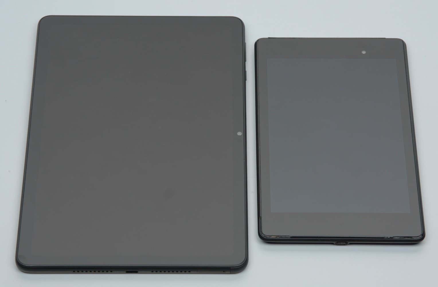Лицевая поверхность экрана выполнена в виде стеклянной пластины с зеркально-гладкой поверхностью, устойчивой к появлению царапин. Судя по отражению объектов, антибликовые свойства экрана лучше, чем у экрана Google Nexus 7 (2013) (далее просто Nexus 7). Для наглядности приведем фотографию, на которой в выключенных экранах отражается белая поверхность (слева — Huawei MatePad SE, справа — Nexus 7, далее их можно различать по размеру):