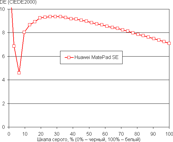 По умолчанию баланс оттенков на шкале серого хороший, так как цветовая температура близка к стандартным 6500 К, и отклонение от спектра абсолютно черного тела (ΔE) меньше 10, что для потребительского устройства считается приемлемым показателем. При этом цветовая температура и ΔE мало изменяются от оттенка к оттенку — это положительно сказывается на визуальной оценке цветового баланса. (Самые темные области шкалы серого можно не учитывать, так как там баланс цветов не имеет большого значения, да и погрешность измерений цветовых характеристик на низкой яркости большая.)