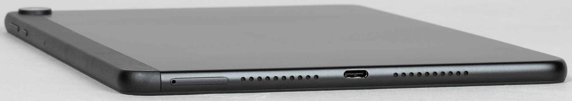 Расположение разъемов и слотов стандартное. На правой грани — USB-C (увы, USB здесь только 2.0, а не 3.1, как у флагмана, но, пожалуй, для обычного домашнего пользователя это не так уж важно) и слот для SIM-карт и microSD. Интересно, что USB-C сдвинут относительно продольной оси.