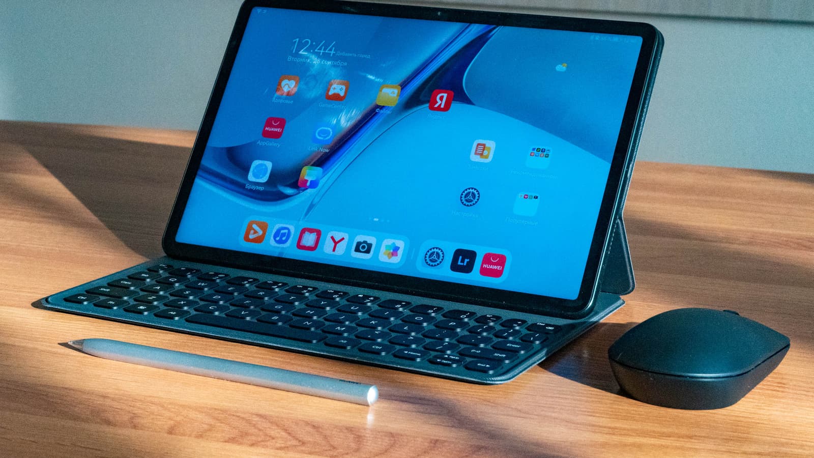 Во-вторых, к MatePad11 можно подключить вообще любую беспроводную клавиатуру, работающую по Bluetooth (то есть не через проприетарный «свисток») — таких на рынке множество. С мышкой всё аналогично — подойдет любая Bluetooth-модель, Harmony OS 2.0 подключится к ней и будет отображать курсор в виде небольшого кружка.