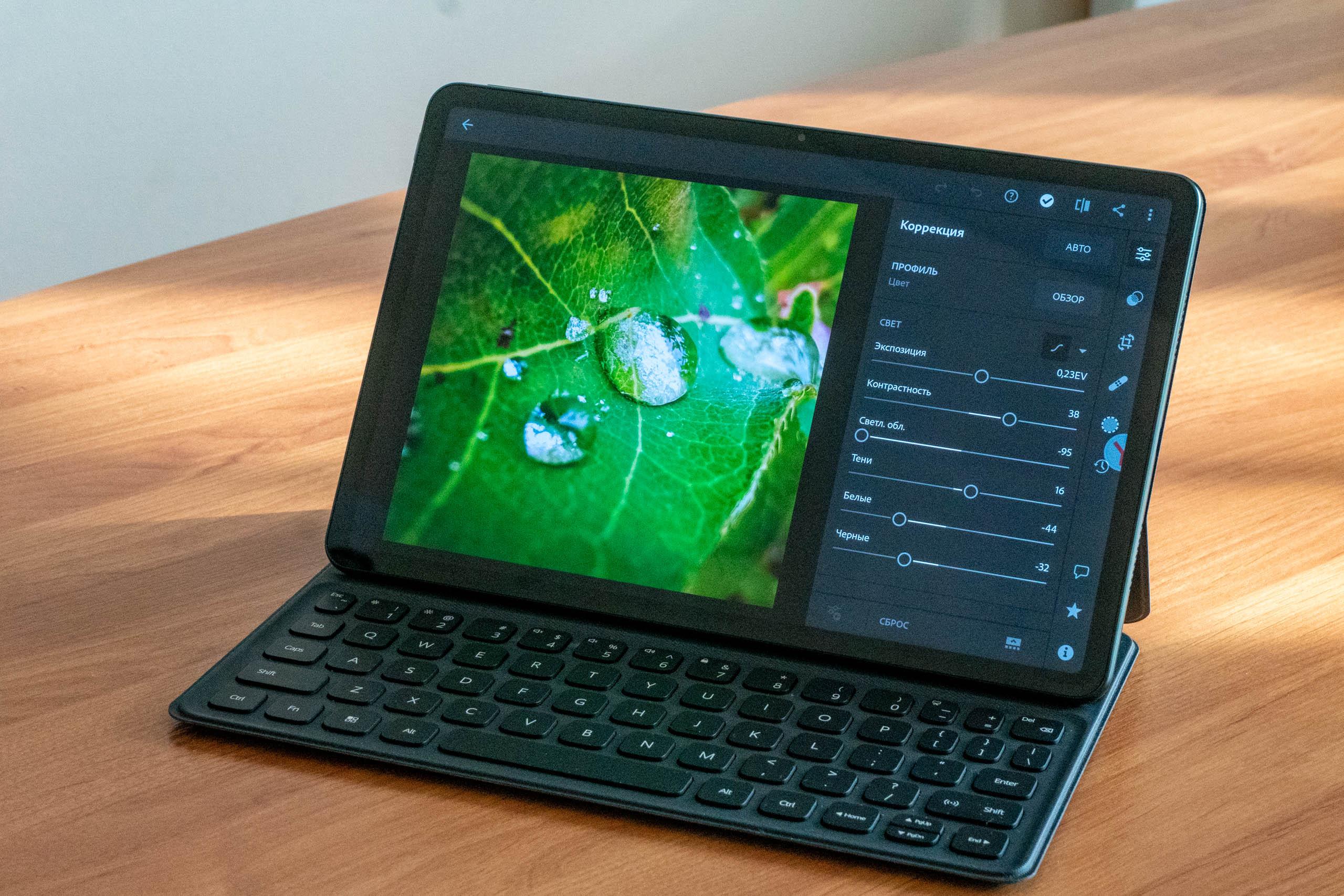 Во-первых, для MatePad 11 сделали чехол-клавиатуру Smart Magnetic Keyboard, вполне подходящую для десятипальцевой печати хоть на столе, хоть на коленях. Планшет можно установить с одним из двух уровней наклона, с чехлом он соединяется без проводов и какого-либо шаманства: просто вложить в обложку и утвердительно ответить на вопрос системы о подключении. Подзаряжать чехол отдельно не придется: всё случится само по себе, без участия пользователя и без проводов.