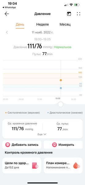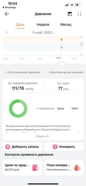 Результат показывается на экране и тут же отправляется на часы в приложение Huawei Здоровье (причем, на смартфон приходит уведомление: «Доступна новая запись кровяного давления». Ну, собственно, ничего нового мы здесь не увидим по сравнению с тем, что показывают сами часы, но зато в приложении собираются данные всех ваших измерений. Кстати, часы можно надеть и на другого человека и измерить давление ему — там есть опция гостевого измерения (отличие лишь в том, что эти данные не отправляются в приложение, только показываются на экране часов).