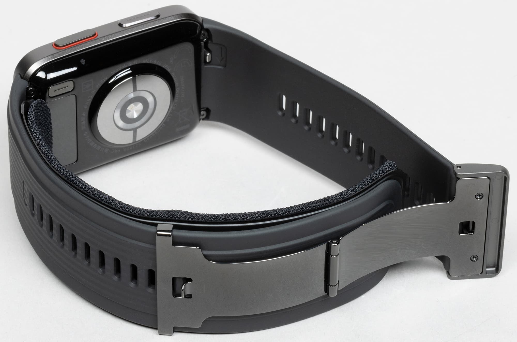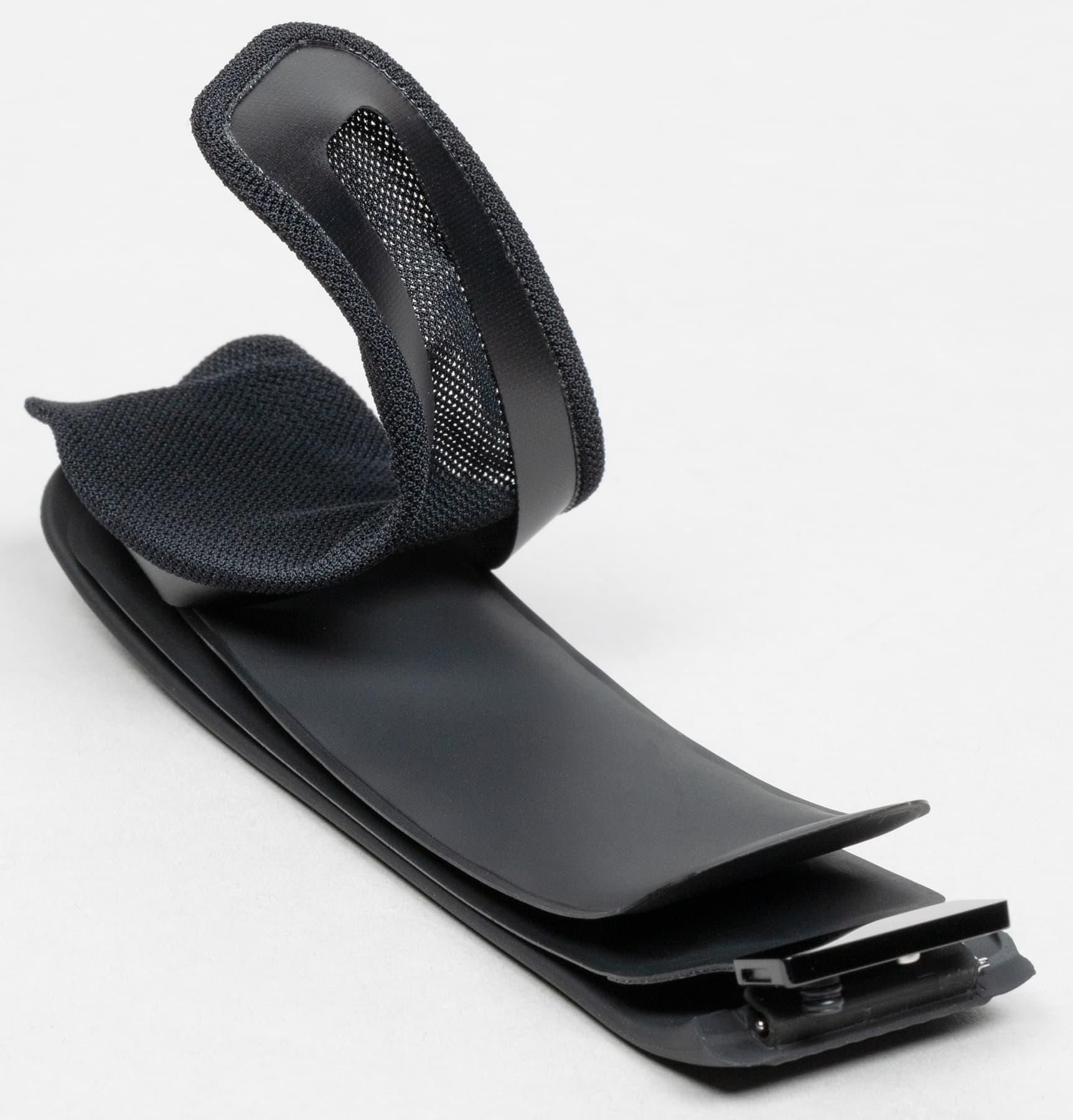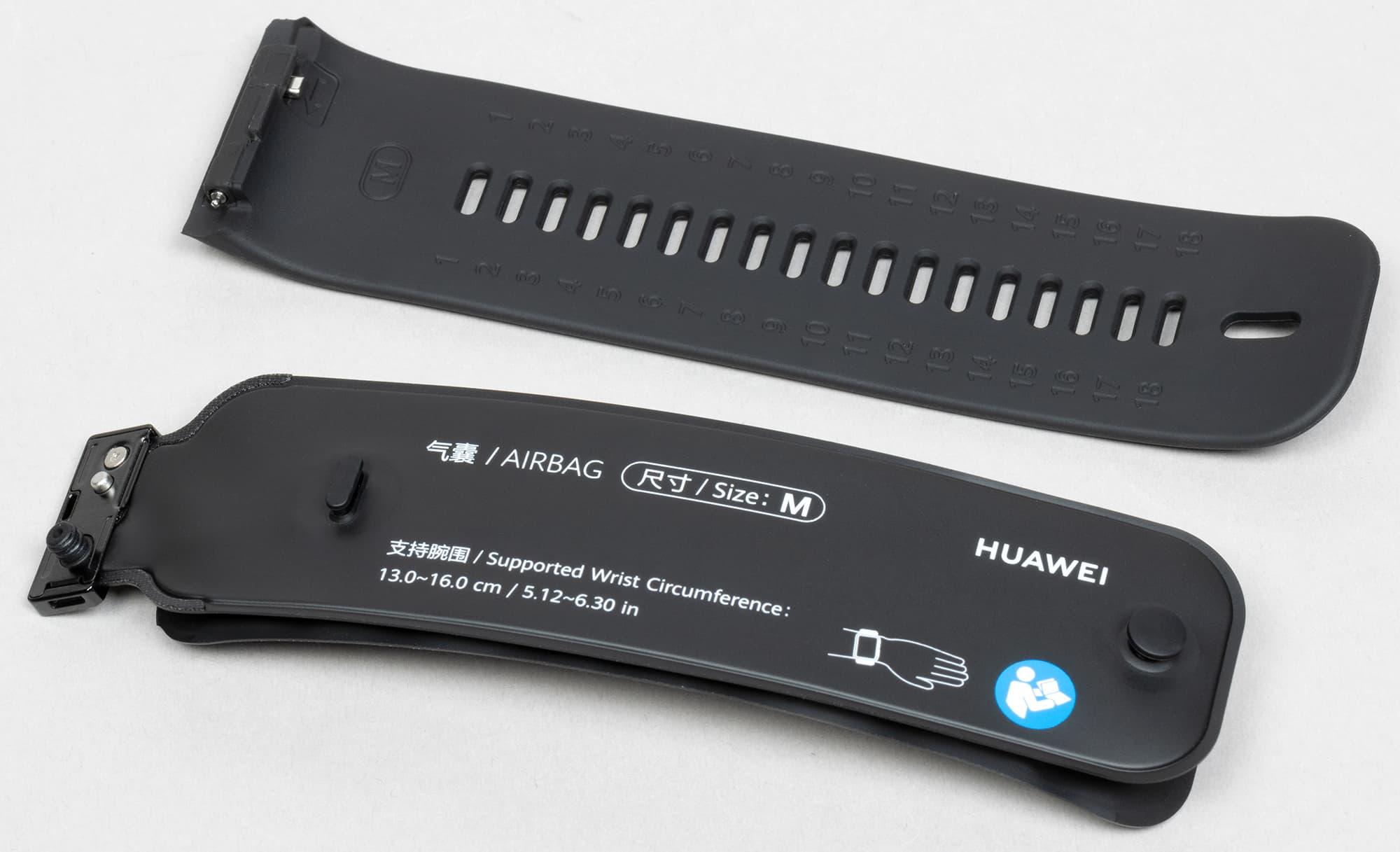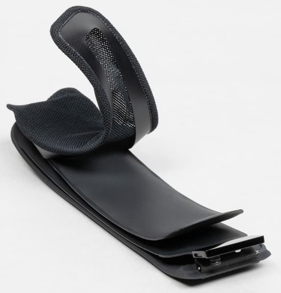 Манжета одета в текстильный чехол, и его можно поменять (как уже было сказано, в комплекте есть сменные — по одному для каждого размера). Крепление к часам — неординарное (с помощью специальной защелки, которую вы можете видеть на фото ниже), но, видимо, как раз это крепление обеспечивает правильную подачу воздуха с помощью микронасоса.