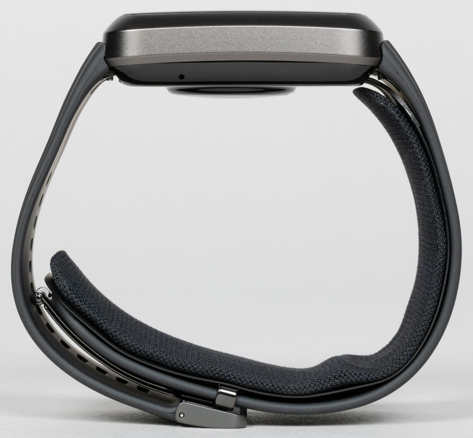 На другой грани нет никаких кнопок и слотов, но обращает на себя внимание отверстие в нижней части. Аналогичное отверстие есть и с противоположной стороны. А поскольку микрофон и динамик здесь отсутствуют, можно предположить, что отверстия нужны как раз для функционирования мини-насоса, накачивающего воздух в манжету.