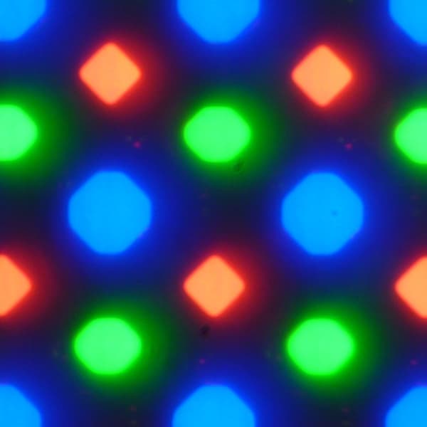 В этом экране используется OLED-матрица — активная матрица на органических светодиодах. Полноцветное изображение создается с помощью субпикселей трех цветов — красного (R), зеленого (G) и синего (B) в равном количестве, что подтверждается фрагментом микрофотографии: