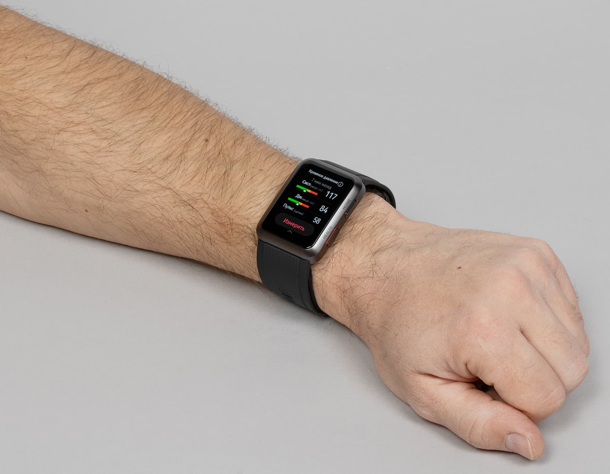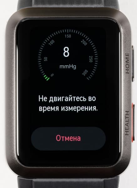 Мы неоднократно протестировали эту опцию на часах и сравнили результаты с показателями медицинского тонометра. Итак, чтобы запустить процесс, надо нажать на кнопку Health, выбрать «Измерить», после чего поднять руку на уровень сердца и, не прижимая ее к телу, по возможности расслабить (полностью это не получится, потому что руку-то приходится держать на весу).
