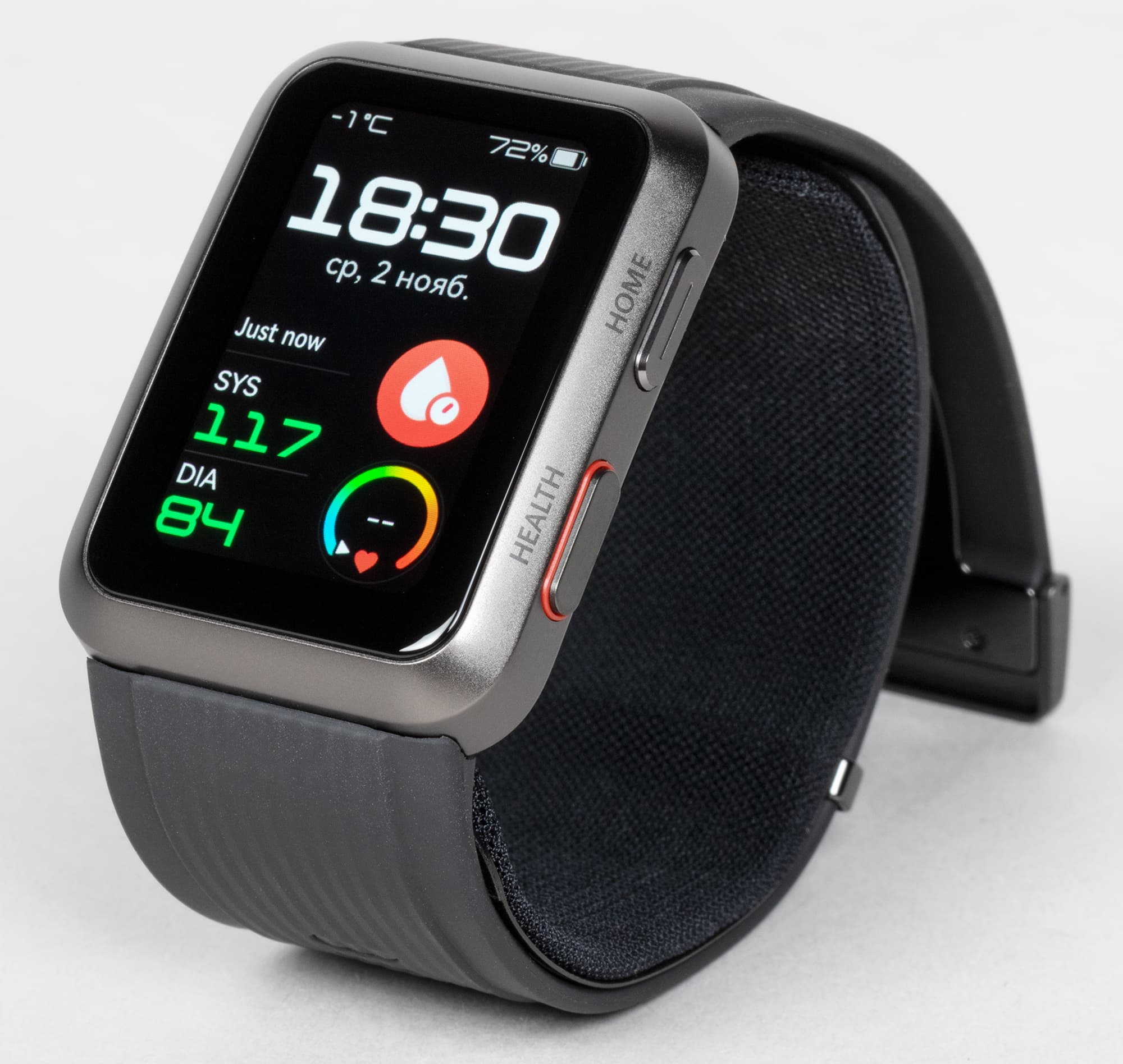 Манжета крепится к ремешку с внутренней стороны, и в обычной жизни не ощущается — ну, ремешок как ремешок. Однако если вы захотите измерить давление, достаточно убедиться, что часы плотно сидят, поднять руку на уровень груди и нажать на старт. Результаты будут показаны на экране и автоматически загружены в приложение на смартфоне. И да, им действительно можно доверять.