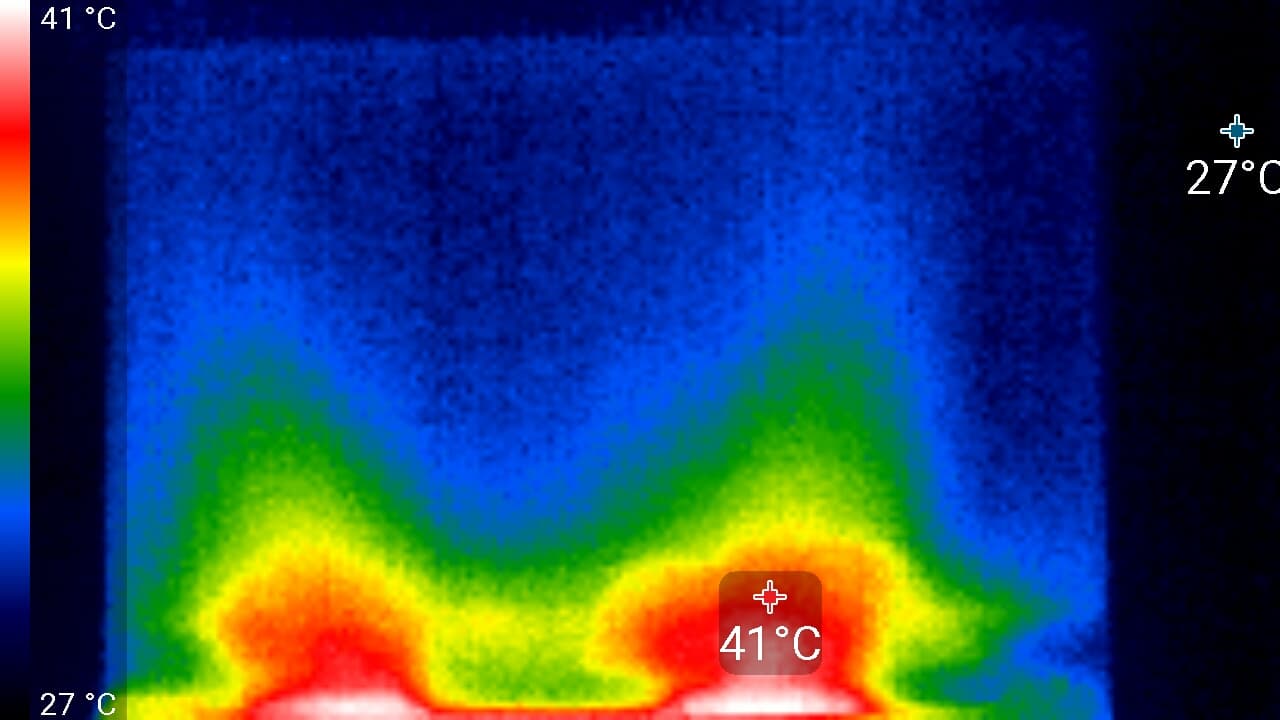 Под максимальной нагрузкой работать с клавиатурой комфортно, так как места под запястьями греются слабо. Держать ноутбук на коленях не доставляет особого дискомфорта, поскольку в соответствующих местах нагрев незначительный. На термоснимке экрана видны две нагретые области в нижней части — в эти места попадает горячий воздух из вентиляционной решетки на дальнем от пользователя торце корпуса ноутбука. Эти пятна скрадывают нагрев от светодиодной линейки подсветки, которая явно располагается в нижней части экрана. Блок питания греется незначительно, у него явно есть запас мощности и на более высокое потребление процессором, зарядку батареи и на питание не очень мощных периферийных устройств, подключенных к ноутбуку.