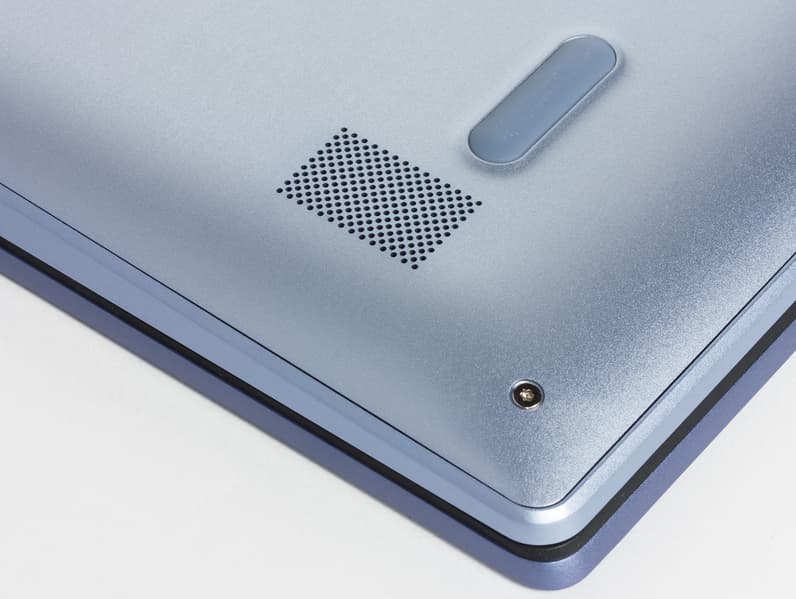 Динамики здесь расположены прямо на днище, но около маленьких резиновых ножек в передней части корпуса, так что установка ноутбука на стол не заглушает звук (а вот на кровать или на колени — теоретически может). Кроме этого, широкая полоса с перфорацией на днище служит для вентиляции: через нее два вентилятора внутренних кулеров всасывают холодный воздух. (Горячий воздух удаляется через вентиляционные отверстия, расположенные в задней части корпуса на плоскости, обращенной к кожуху на петлях крышки.)