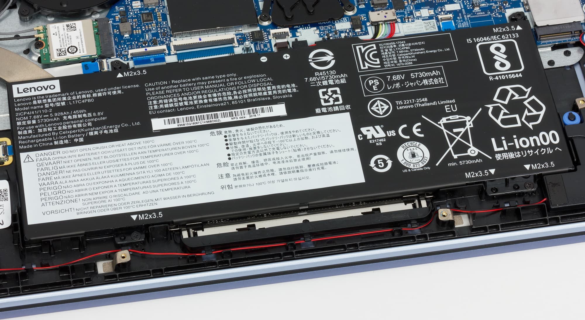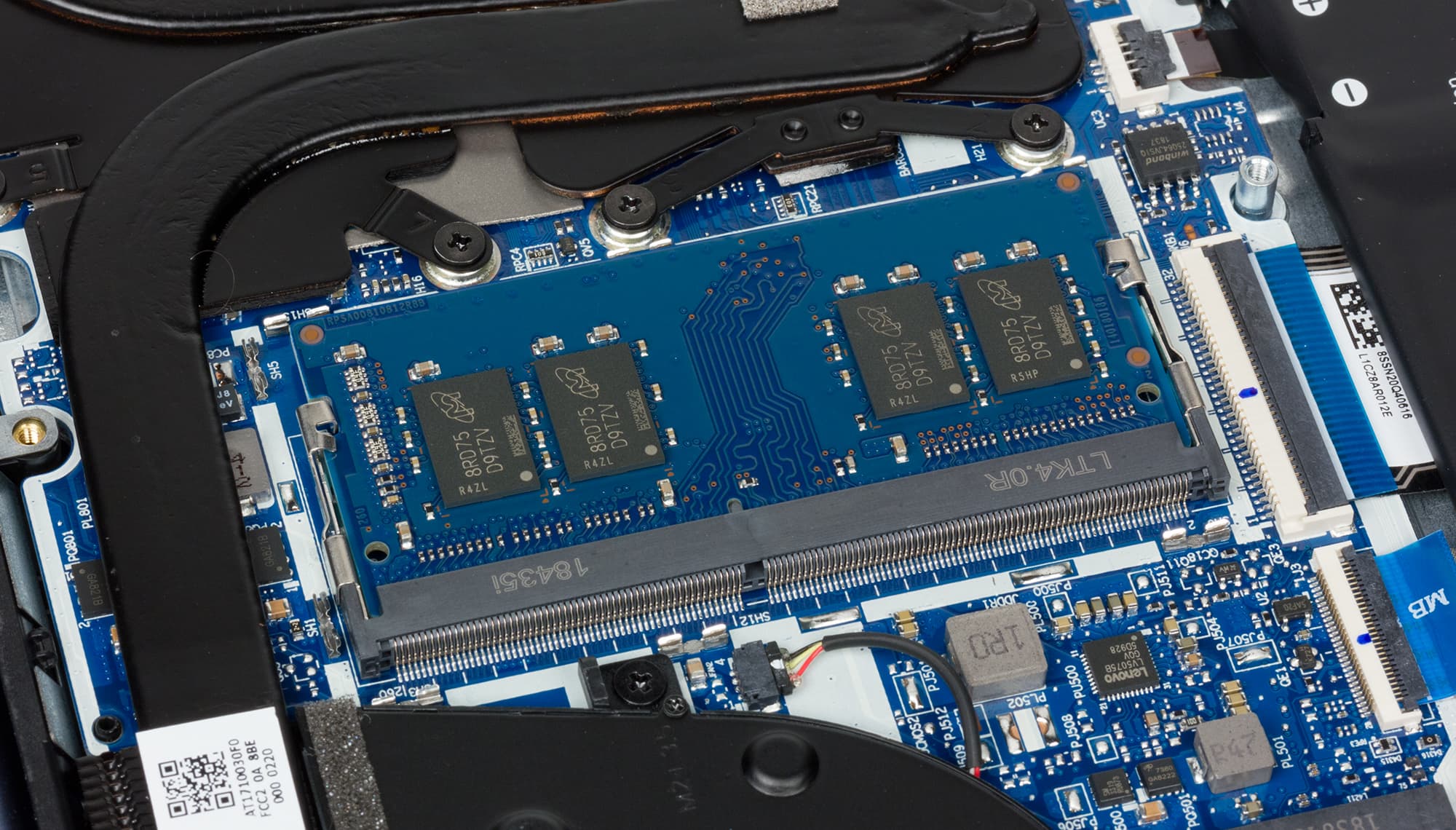Снять нижнюю панель корпуса в целом не сложнее, чем обычно, только придется использовать отвертку под шлиц Torx («звездочка»). Снятие панели открывает доступ к обоим кулерам, несъемной батарее, модулю беспроводной связи, модулю памяти в единственном слоте и двум слотам M.2 — в один из них (формата 2280) установлен системный SSD, второй (формата 2240) пуст.
