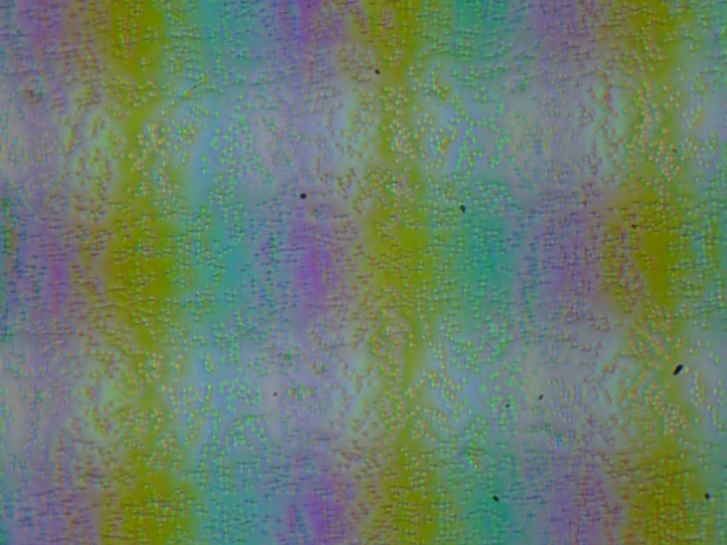 Зерно этих дефектов в несколько раз меньше размеров субпикселей (масштаб этих двух фотографий примерно одинаковый), поэтому фокусировка на микродефектах и «перескок» фокуса по субпикселям при изменении угла зрения выражены слабо, из-за этого нет и «кристаллического» эффекта.