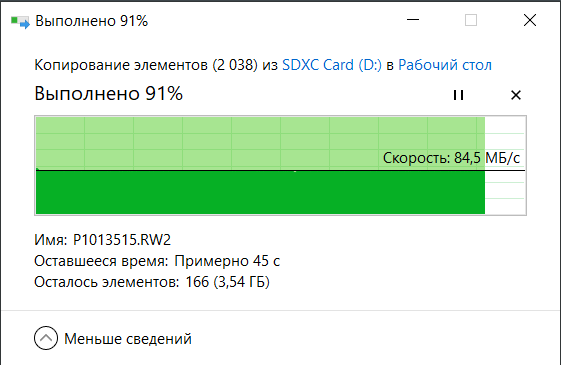 Копирование файлов с карты памяти на Рабочий стол трансформера заняло 8 минут 32 секунды при средней скорости 85,6 МБ/с.