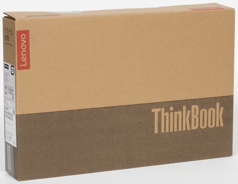 Внешняя упаковка представляет собой невзрачную коробку из утилизированного бумажного сырья с логотипом Lenovo в верхнем левом углу, серой полосой и надписью ThinkBook снизу. Коробка не имеет пластмассовой ручки-вставки, поэтому переносить ее неудобно, а повторно использовать — бессмысленно: пространство внутри не предусматривает отдельных отсеков для хранения принадлежностей (кроме бокового пенала для блока питания).