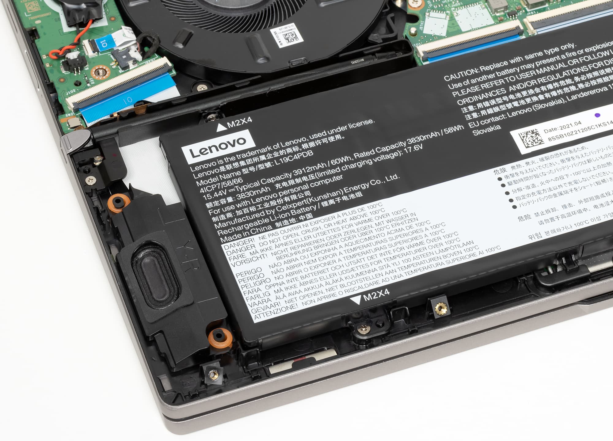 Как и подобает всякому портативному ПК, Lenovo ThinkBook 14s Yoga ITL использует предоставленный ему внутренний объем с максимальной эффективностью. Отметим сразу, что нас порадовало отсутствие висящих проводов, которые недолго задеть и повредить при неумелом рукоприкладстве. Это косвенно свидетельствует о том, что конструктив хорошо продуман. Видно, что инженеры старались, и спасибо им за труд.