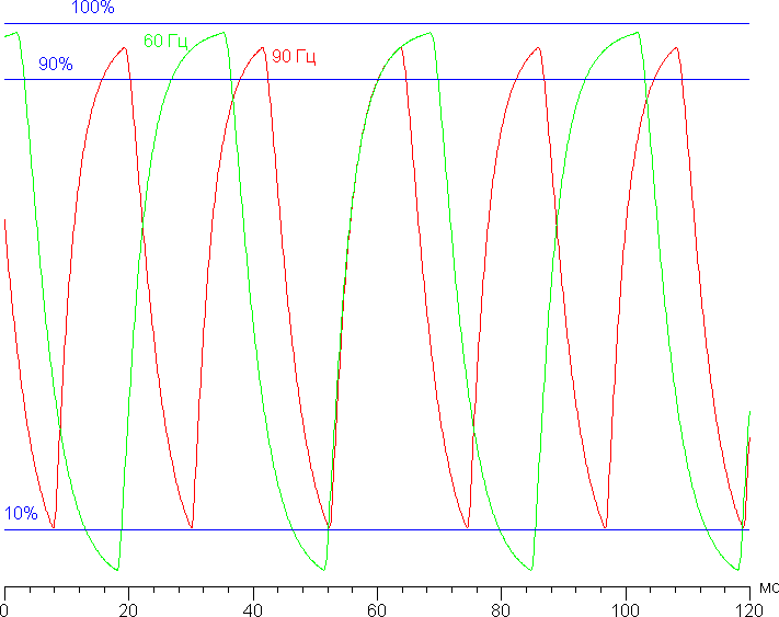 Посмотрим, хватит ли такой скорости матрицы для вывода изображения с частотой 90 Гц. Приведем зависимость яркости от времени при чередовании белого и черного кадра при 90 Гц кадровой частоты (и для сравнения при 60 Гц кадровой частоты):