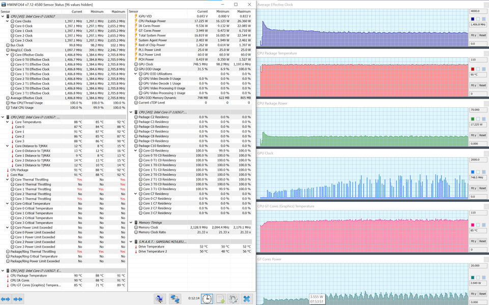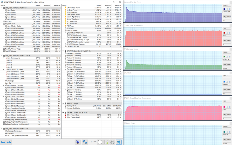 Под максимальной нагрузкой на процессор тактовая частота последнего в коротком начальном периоде взлетает до 3,5 ГГц с одновременным броском потребления до 40 Вт. Спустя всего 6 секунд оба этих показателя понижаются: в первой фазе очень быстро, а затем очень медленно. Огибающая напоминает график гиперболической функции с тем отличием, что примерно на отметке 30 секунд происходит второй подброс частоты и потребления, но на этот раз весьма малый по амплитуде. Он разрывает гиперболу вскоре после начала ее пологого нисходящего сегмента. На четвертой минуте теста оба показателя стабилизируются на отметках 2 ГГц и 18 Вт (это значительно ниже паспортных значений процессора Intel Core i7-1165G7) и далее удерживаются на этих отметках до самого конца. Температура в первую же секунду возрастает до 90 °C и далее колеблется в пределах ±1 °C. Шум вентилятора слышен, но по громкости слишком мал, чтобы его замечать.